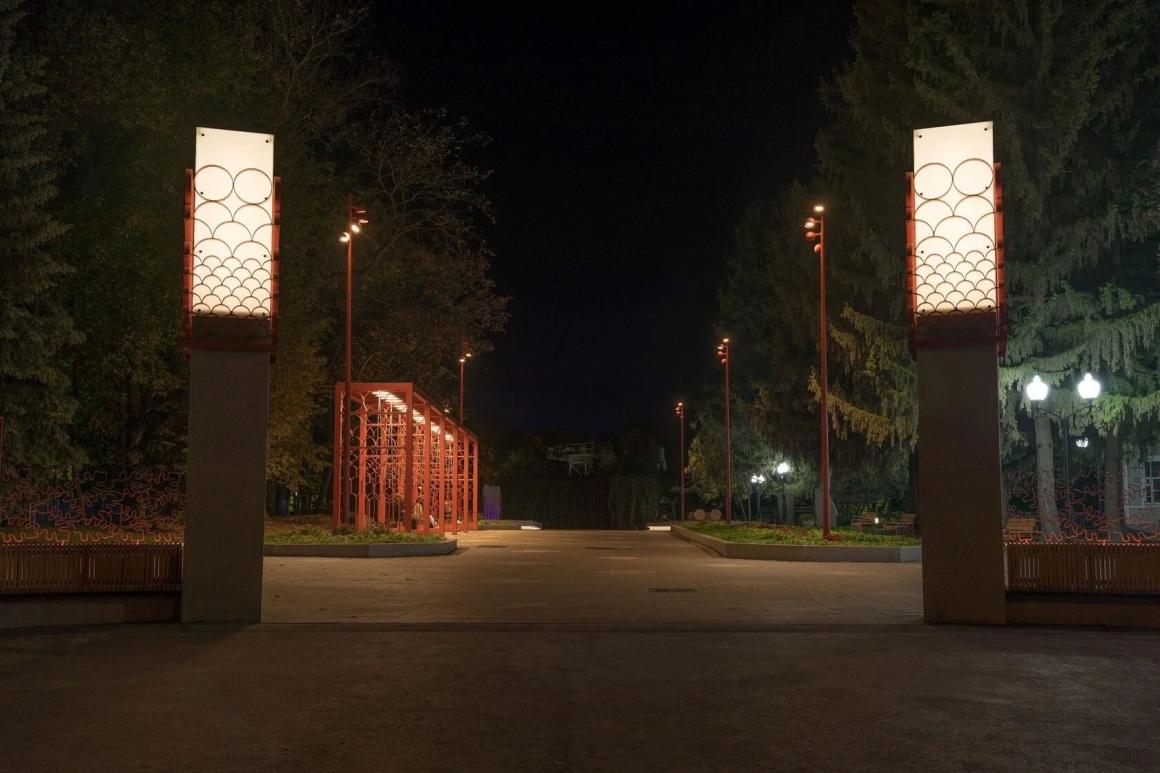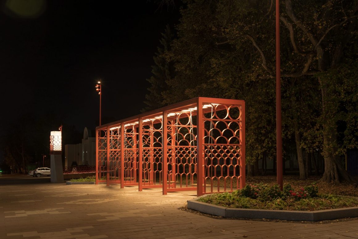 Phase One reimagined the park’s formal entrance and the area surrounding the historic planetarium. The entrance square gained a distinct identity with illuminated pylons and a large lettering installation as a focal point, complemented by a composition of octagonal flowerbeds and fountains. The planetarium is now framed by a landscape that subtly references the wooden pavilions of the past century. Small architectural forms, such as benches with a “scale” ornament, reinterpret historical motifs through contemporary materials and plasticity.