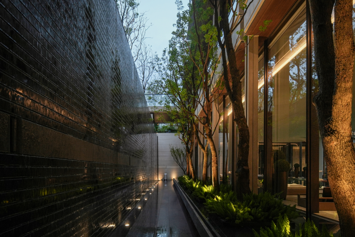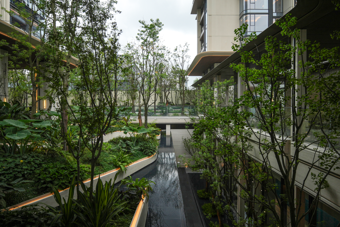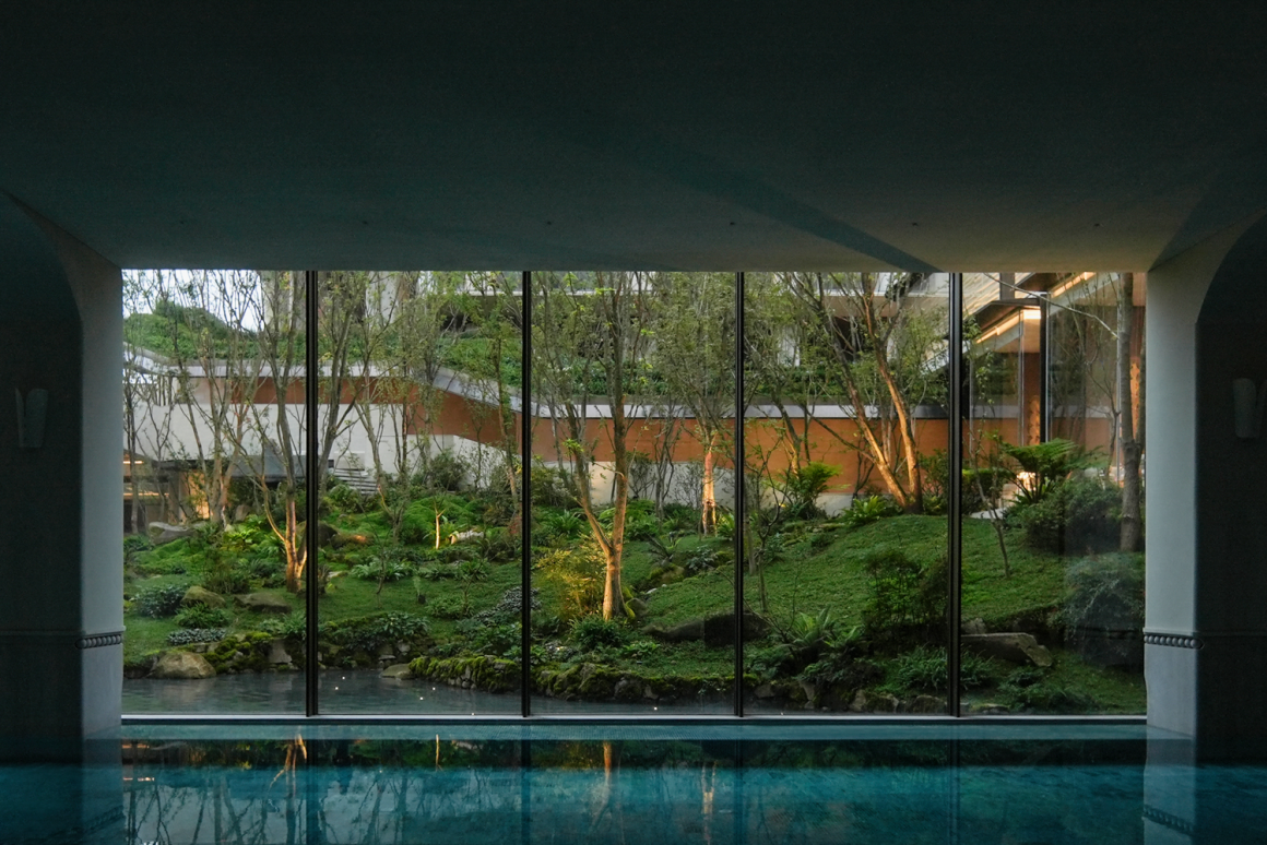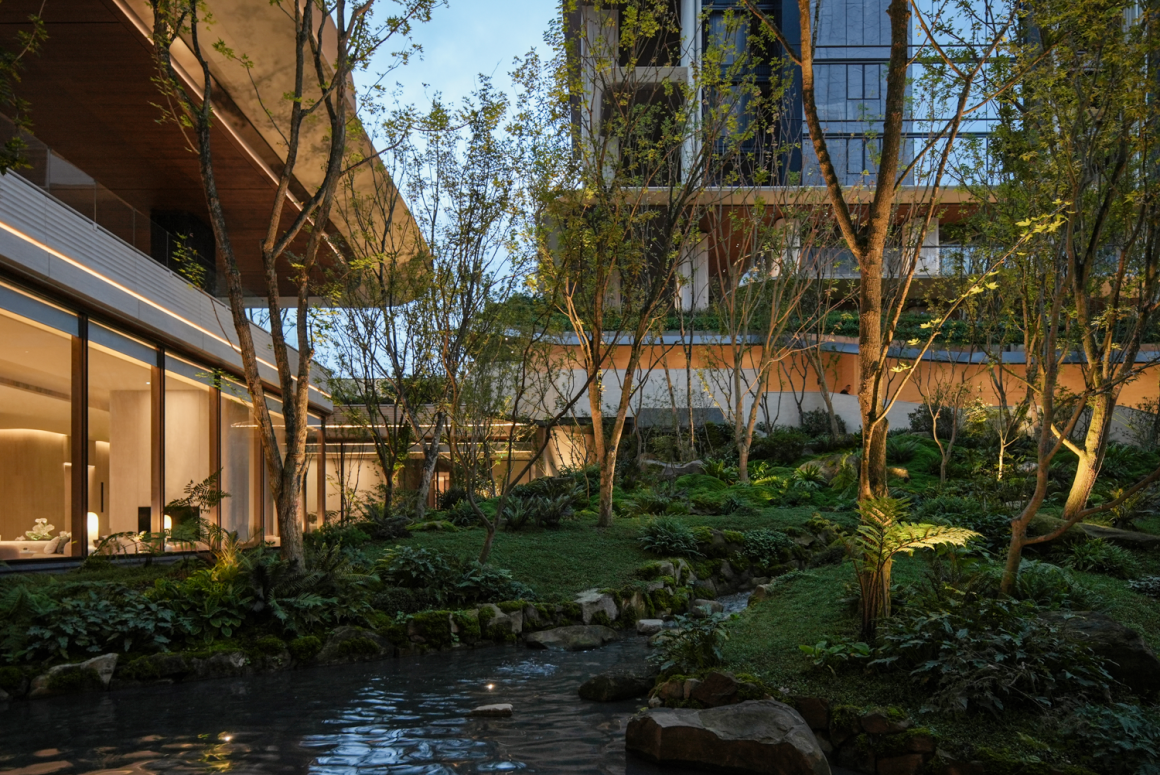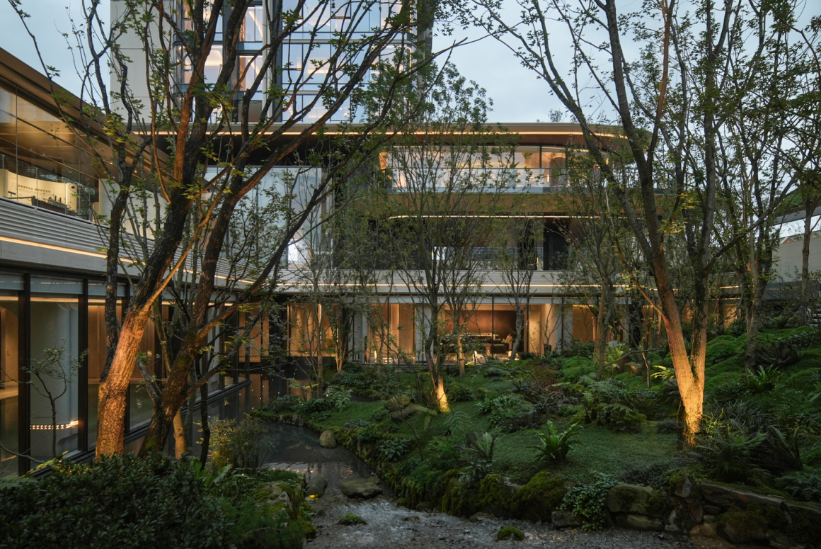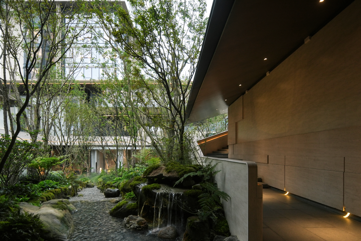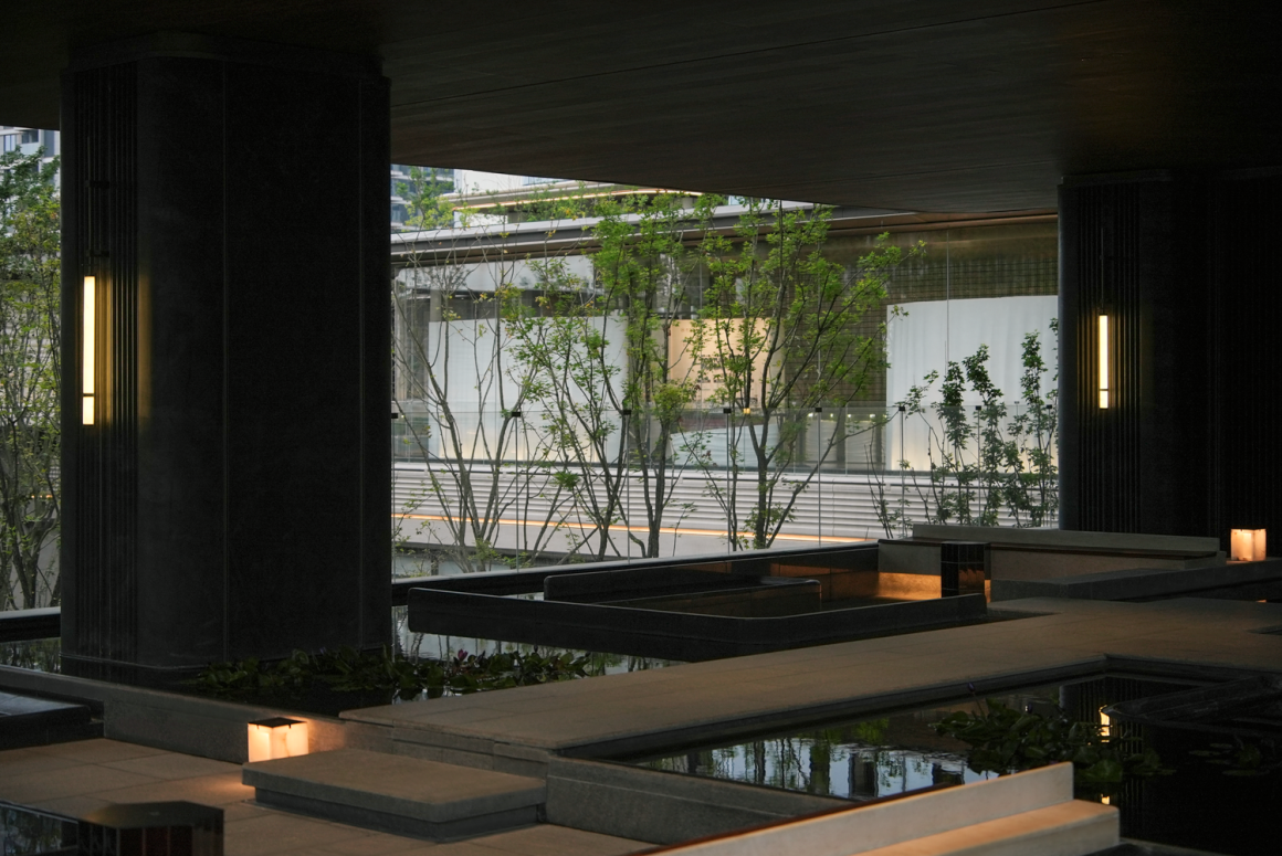 The sunken courtyard introduces the landscape concept of mountains and rivers in western Sichuan, absorbs the elegant temperament of Aman in Kyoto, builds a moss court with original stones, and integrates the essence of modern city with the luxury experience of natural tranquility. The technique of “hiding and revealing, collecting and releasing” has been reinterpreted here – through precise control of a 6.5-meter height difference and a 40 meter depth space, three-dimensional creation is achieved, with deep dialogue between moss fields, stone landscapes, and light and shadow.
