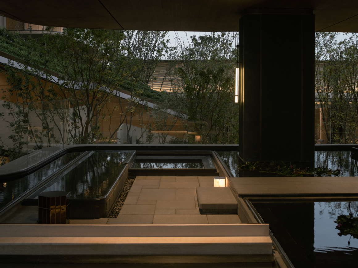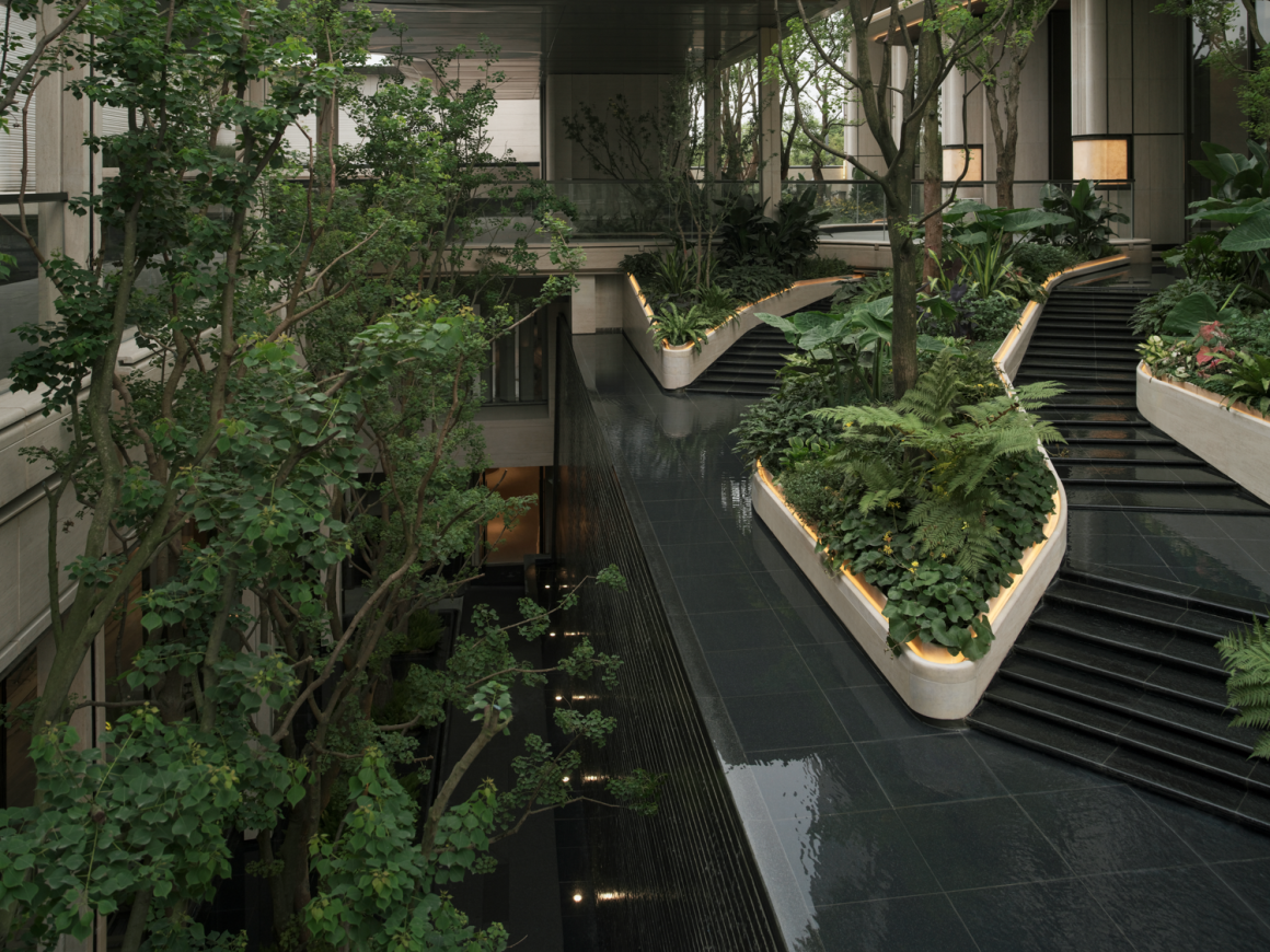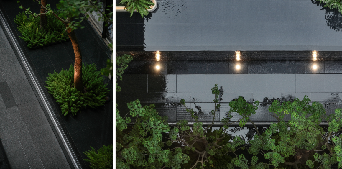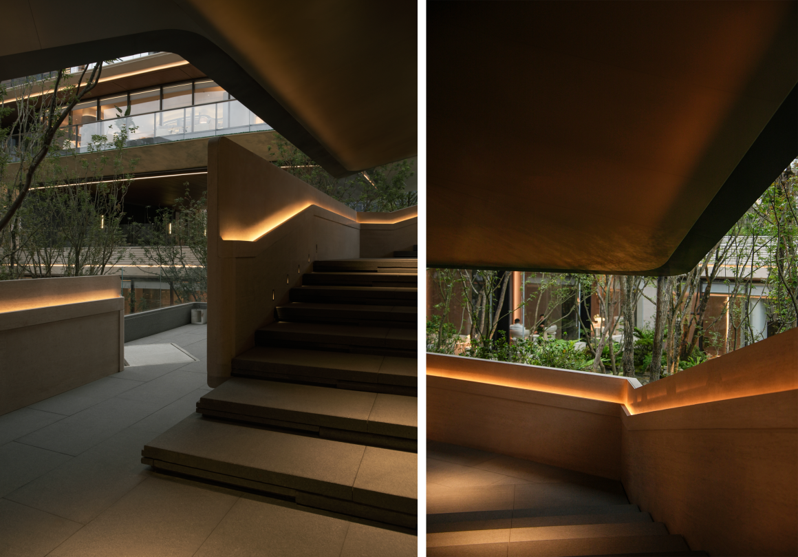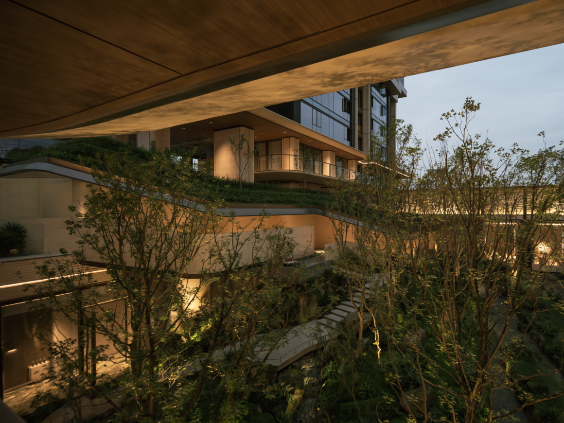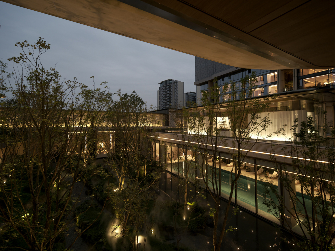 The sunken courtyard introduces the landscape concept of mountains and rivers in western Sichuan, absorbs the elegant temperament of Aman in Kyoto, builds a moss court with original stones, and integrates the essence of modern city with the luxury experience of natural tranquility. The technique of “hiding and revealing, collecting and releasing” has been reinterpreted here – through precise control of a 6.5-meter height difference and a 40 meter depth space, three-dimensional creation is achieved, with deep dialogue between moss fields, stone landscapes, and light and shadow.