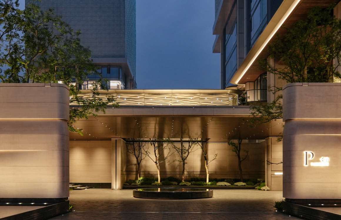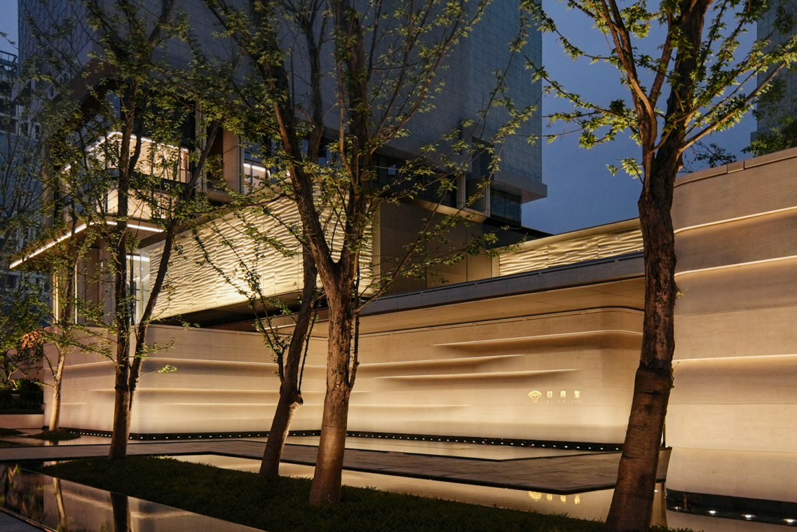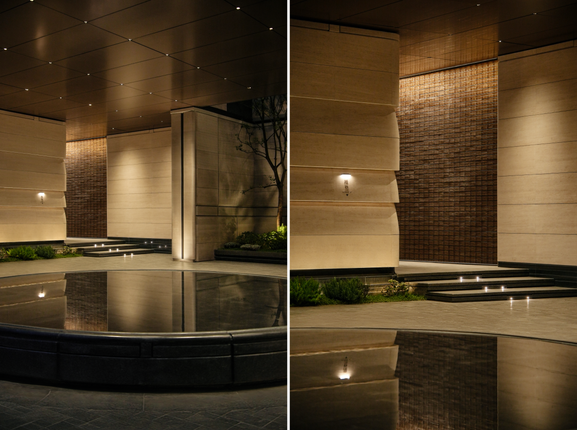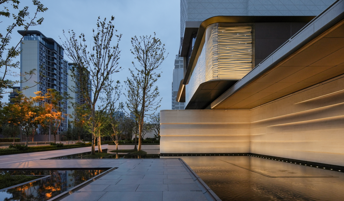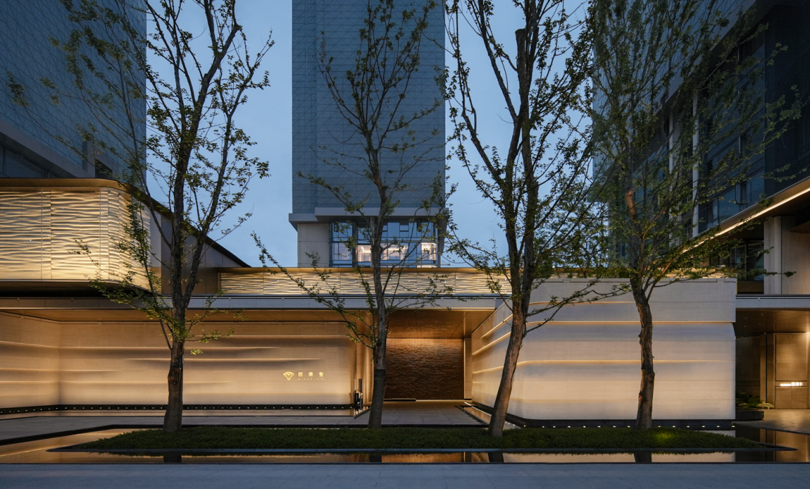 Using water as a guide and welcoming with etiquette,Create a roundabout style drop off experience with an exquisite circular water feature. The main body of the water feature is made of finely carved stone, with a warm and jade like surface that reflects the light. It presents delicate and changing layers of light and shadow under different lighting conditions, creating a flowing rhythm in the static water feature. It is the visual core of finely carved stone on the way home.
