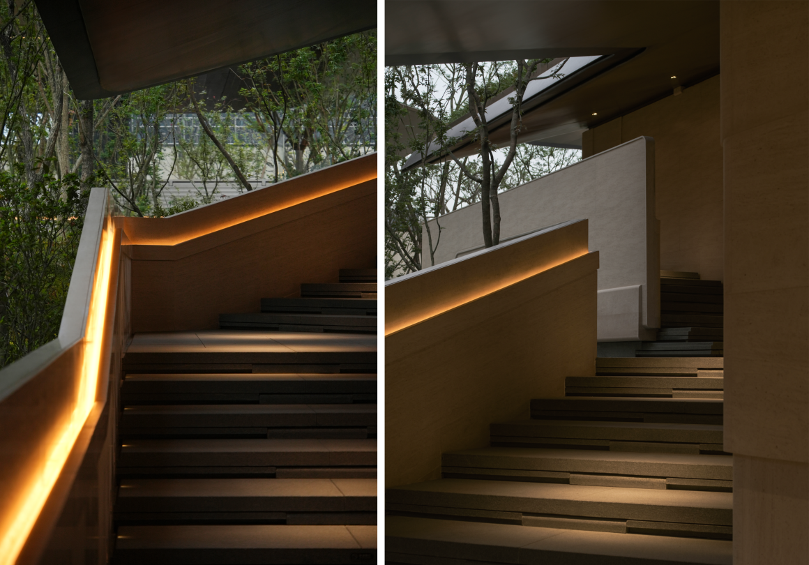 作为连接下沉庭院与售楼处的关键枢纽,我们摈弃了直白的通行逻辑,转而打造了一座以“折转洄游”为灵魂的秘境画廊。