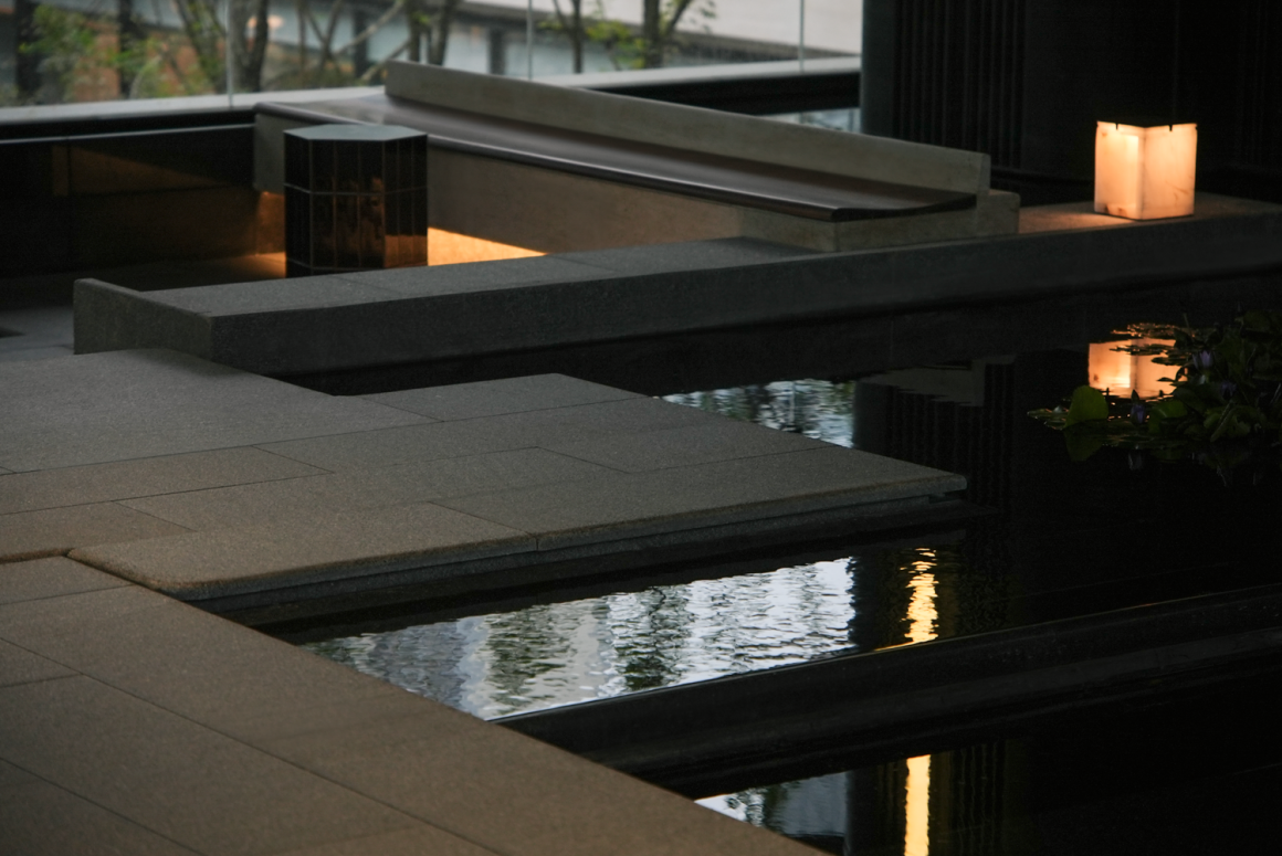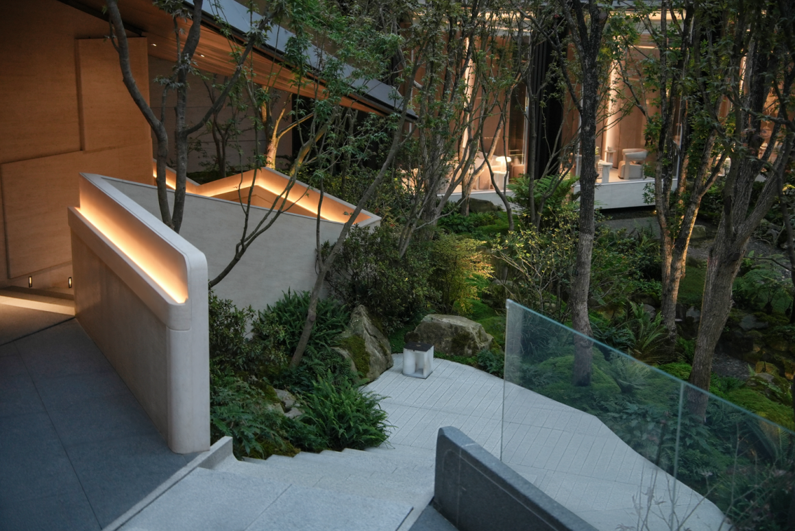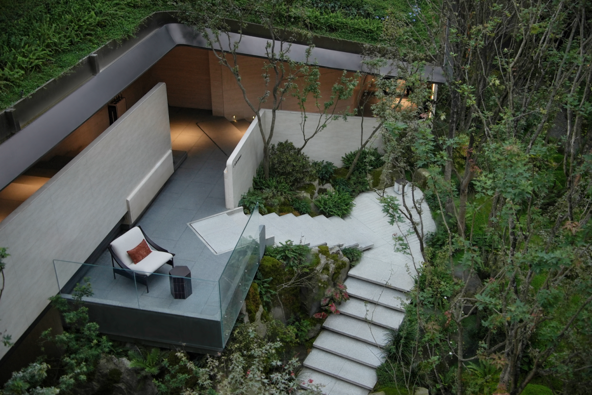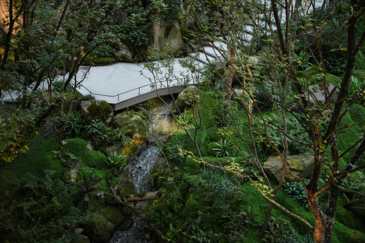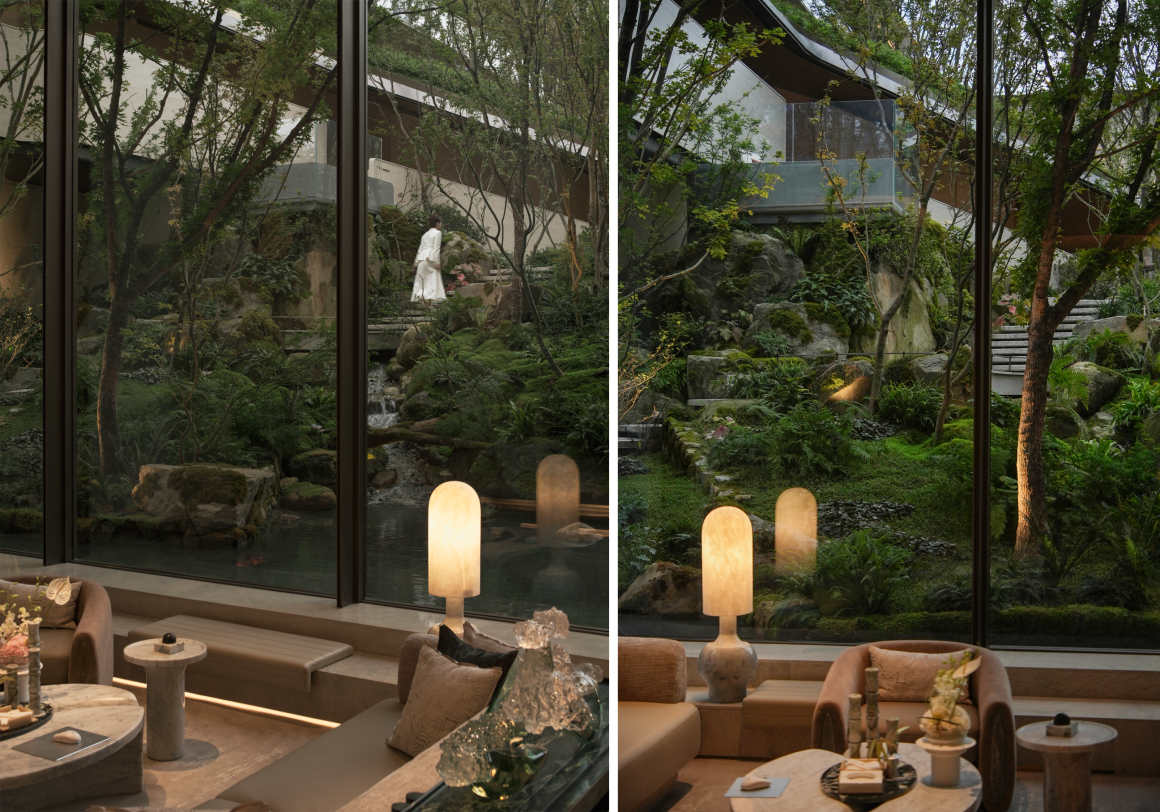 下沉庭院引入川西寄山融水坡地园林理念,汲取京都安缦的优雅气质,以原石堆砌苔野之庭,融合现代都市精华于自然静谧的奢华体验。“藏与露、收与放”手法在这里得到全新诠释–通过6.5米高差,40米进深空间的精准把控立体营造,苔野、石景、光影深度对话。