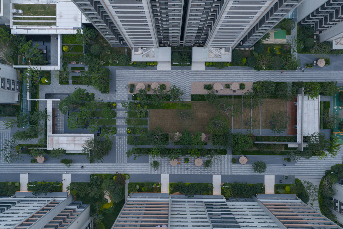 The overall design emphasizes fluid, interwoven circulation routes, a balanced spatial sequence that enhances user experience, and a figure-ground relationship that blurs the boundaries between architecture and landscape. The communal landscape—an elongated 200-meter east-west corridor enclosed by six high-rise buildings—is framed by surrounding fire access lanes.