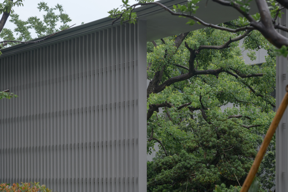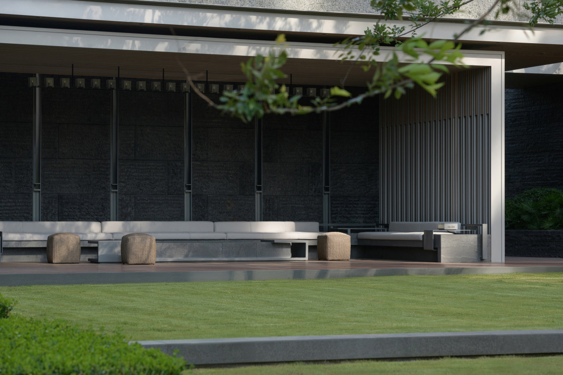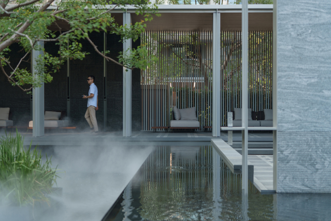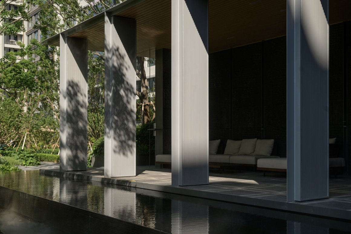 Situated at the golden ratio point along the elongated site, the Landscape Lounge Pavilion is elevated on slender pilotis. Its framework is clad in a refined monochromatic gray palette, where silver aluminum panels and black bush-hammered stone yield their chromatic interplay to the shifting light and shadow.