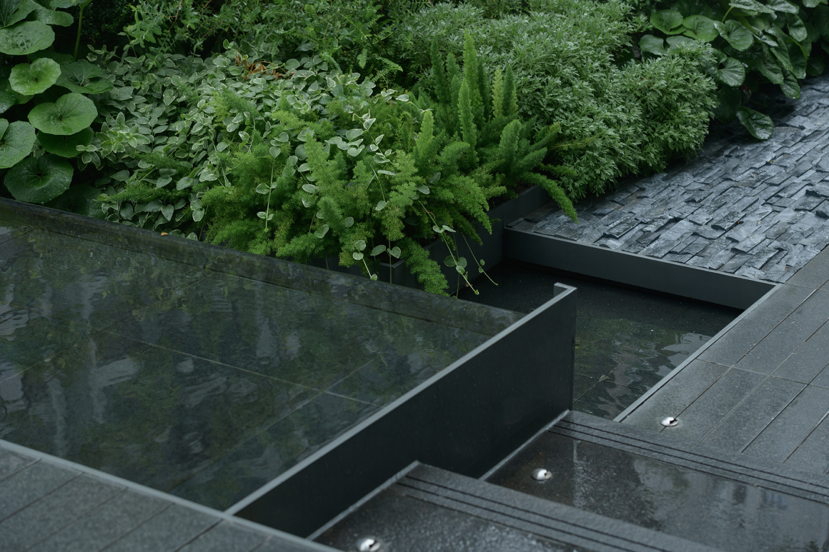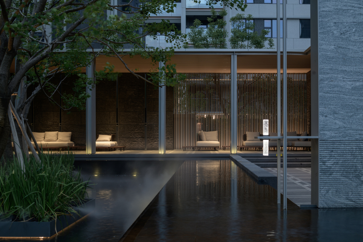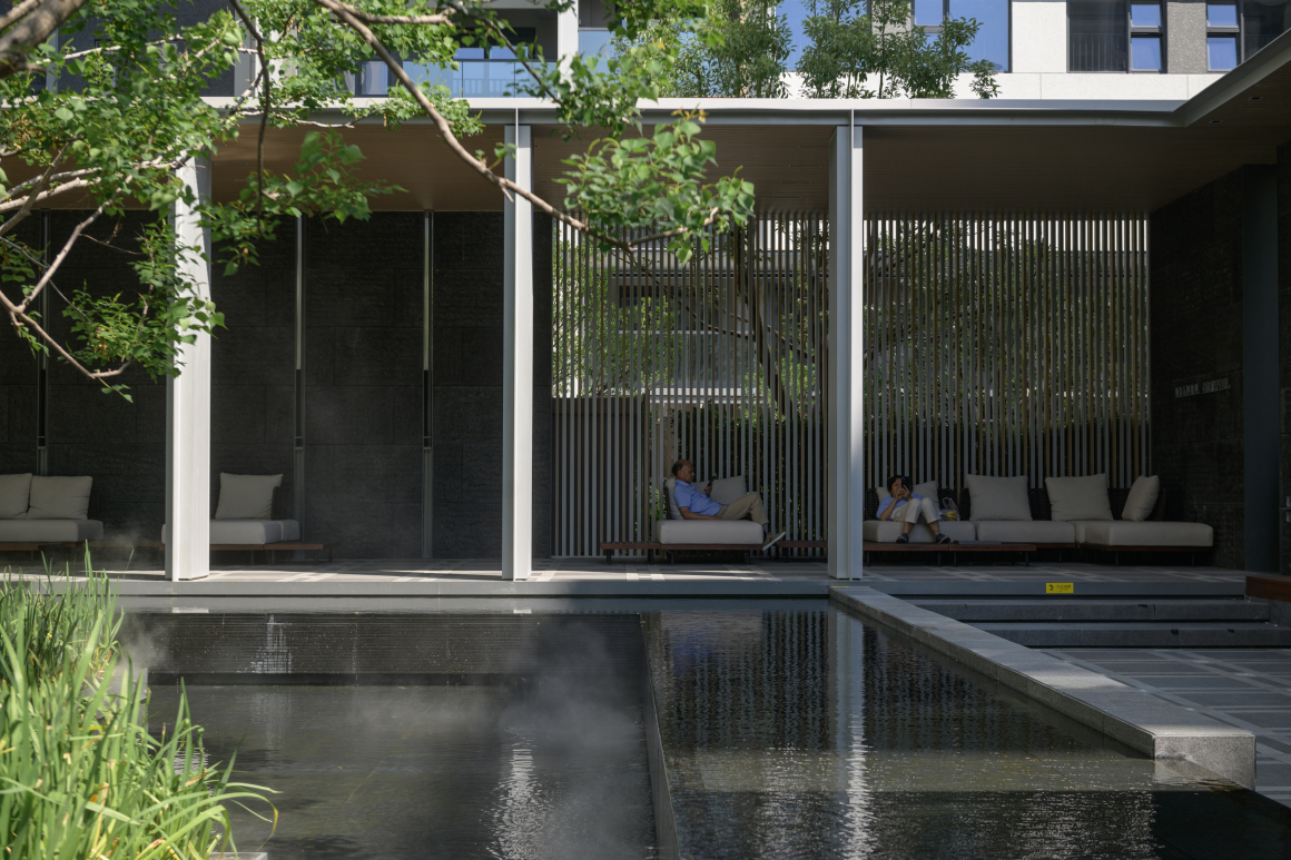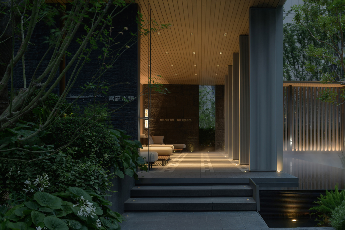 穿行归家大堂,摆脱城市的浮躁与倦怠,流水潺潺的层级跌水,形成生机勃勃的通道,引导人们走向内心的宁静。