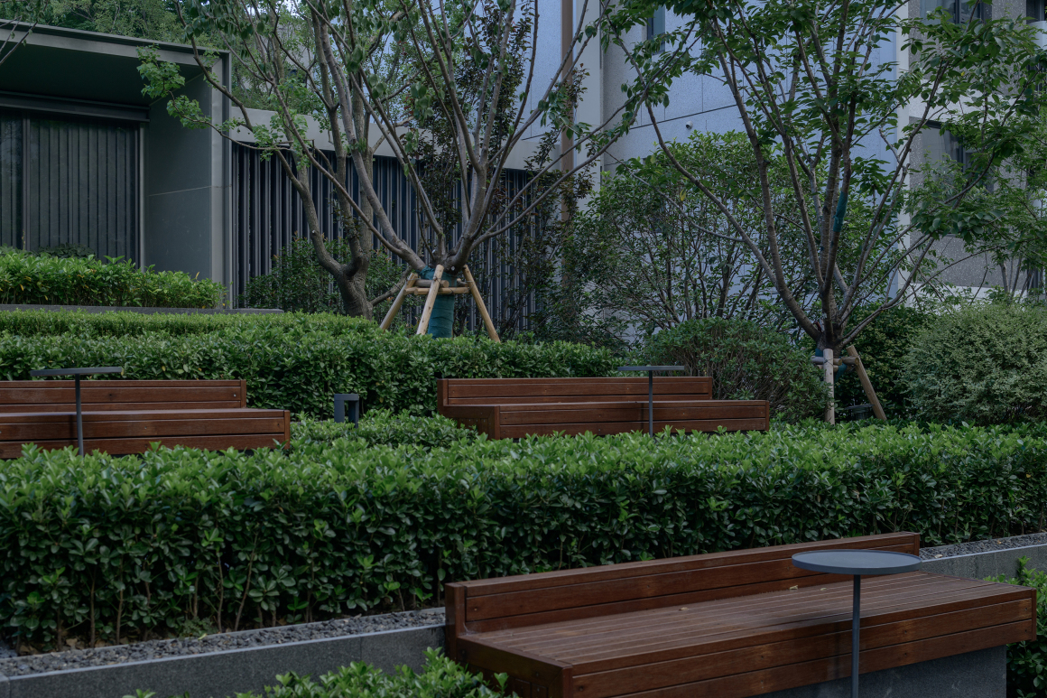 The L-shaped layout of the leisure area alleviates the sense of oppression from the building facing the main entrance. Oriented toward the expansive landscape vista, the bench seating area is thoughtfully positioned behind a scrim wall—a subtle design gesture that envelops visitors in a harmonious connection with nature, immersing them in a serene and elegant living experience.