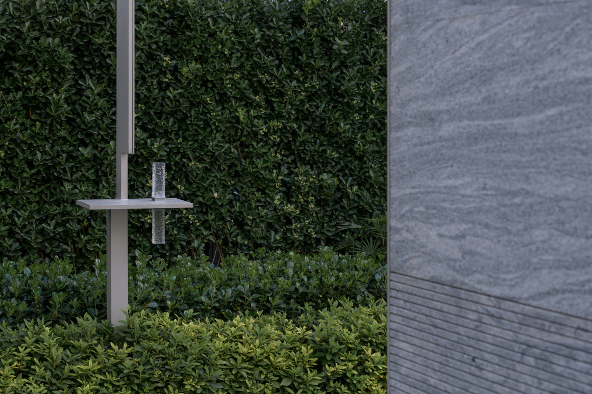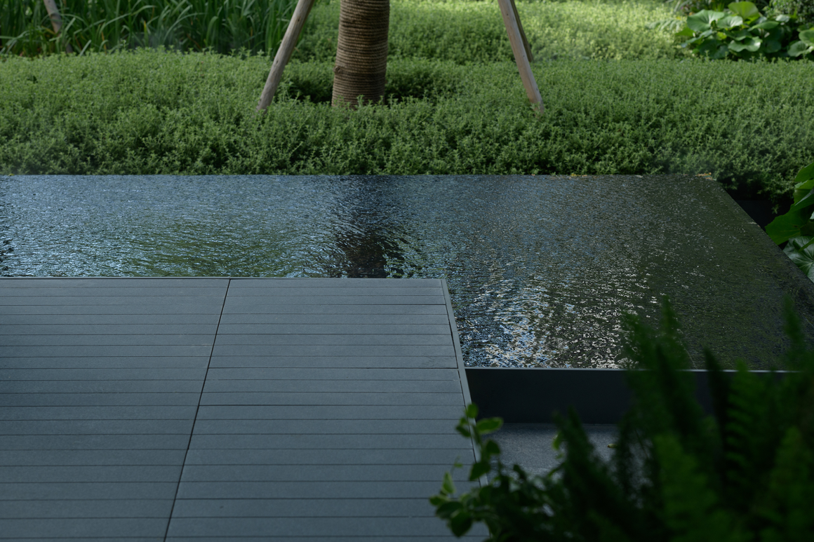 景观会客厅设置在狭长宅间的黄金分割点上,并对场地做架空抬高处理。构架的主体色彩回归纯粹的高级灰,银色的铝板与黑色毛面石材将构架的色彩关系交还给光影。