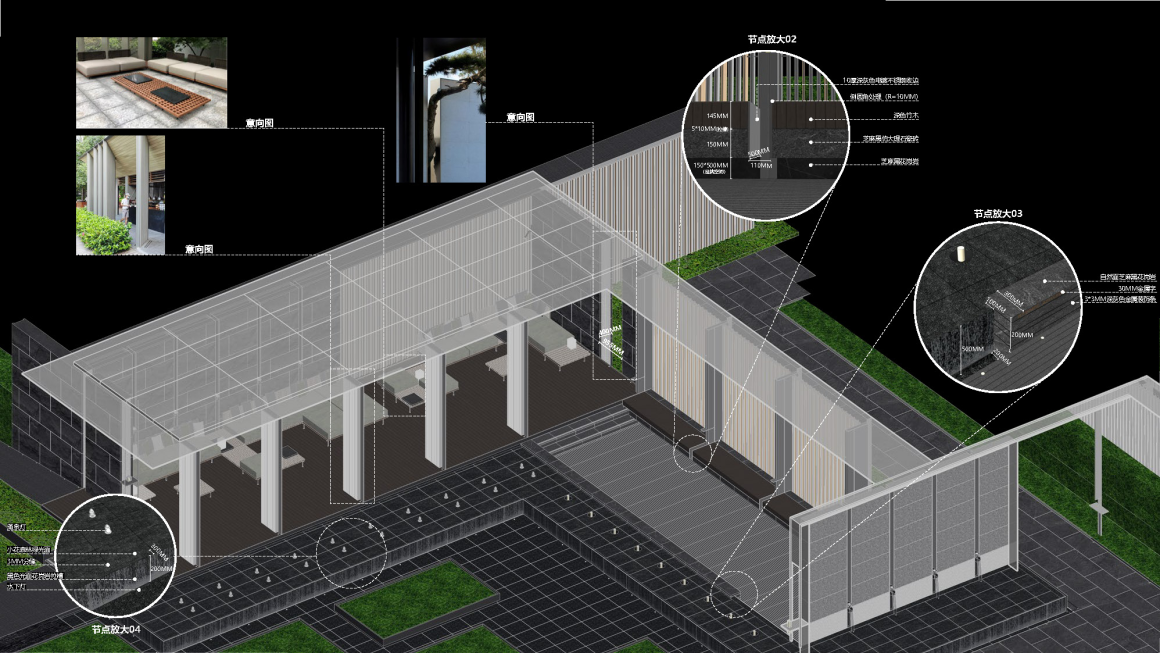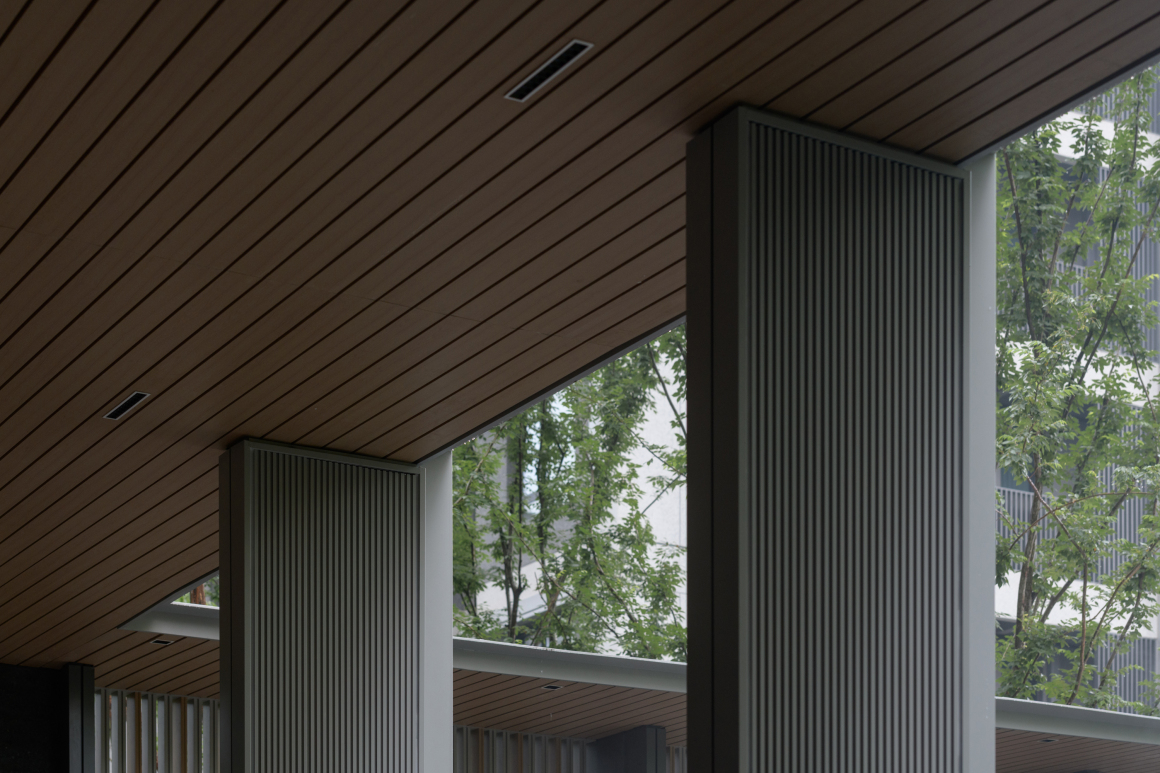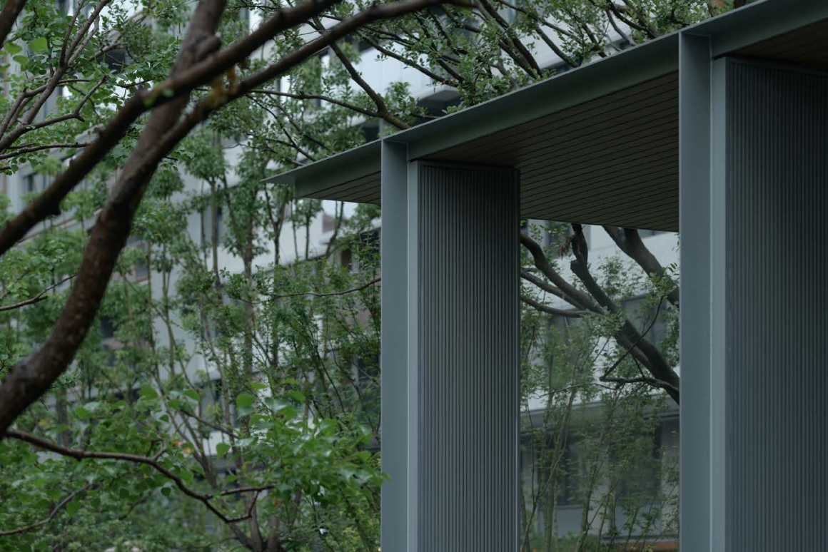 The composite pergola space, designed as a multifunctional space for both viewing and resting, employs multi-tiered framing structures of monumental scale—imbued with postmodern undertones that showcase its tectonic craftsmanship.