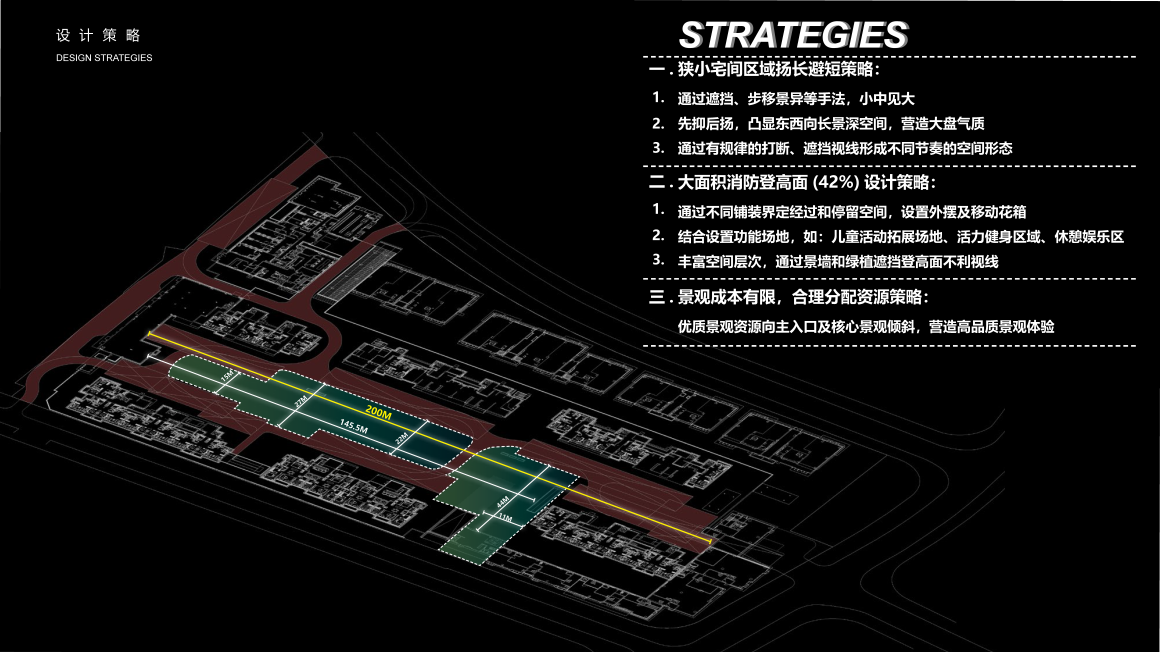 整体注重游园动线的交错流动性、空间序列的均衡性与体验感,以及建筑与景观相互渗透的“图底关系”。社区景观空间由6栋高层围合形成东西向200M的狭长性景观空间,且周围环绕消防登高面。