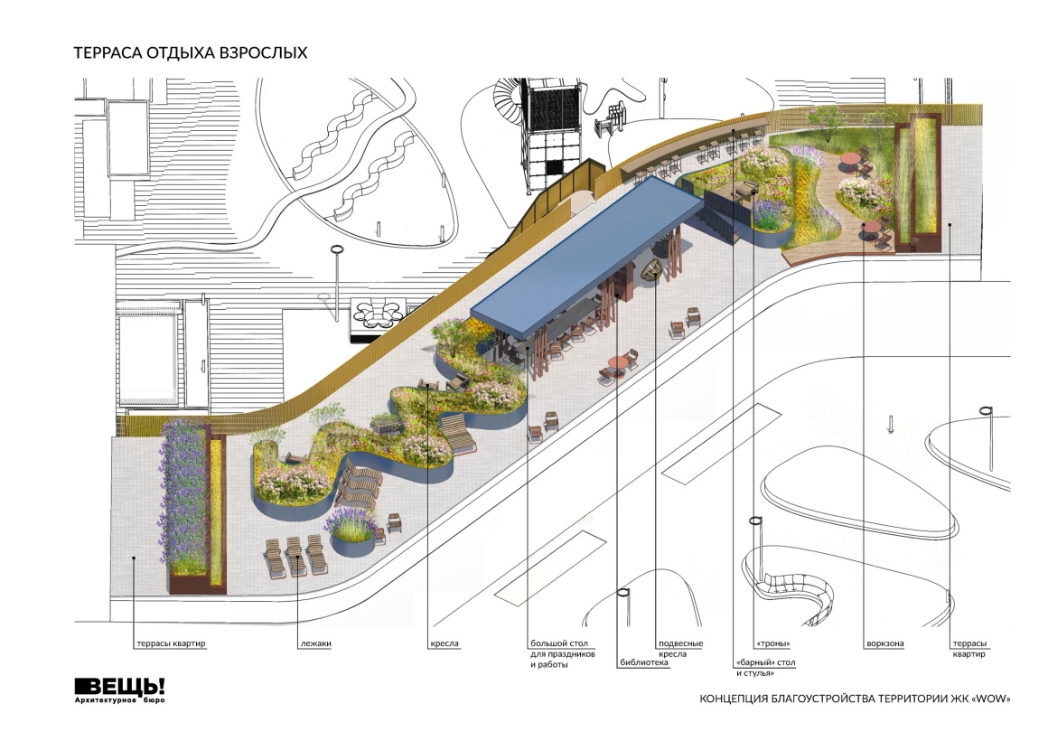 二层平台主要面向成人休闲活动,设有带遮阳的座椅空间;其下方则布置了开放式小型图书区、悬挂座椅和公共桌椅。屋顶露台在垂直方向上延展了庭院空间,提供日光躺椅与休息座位,并可远眺莫斯科河的全景。
