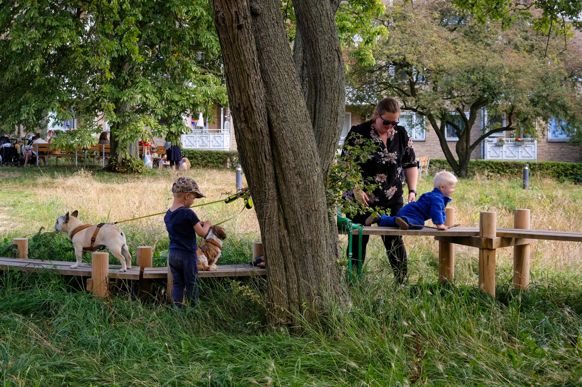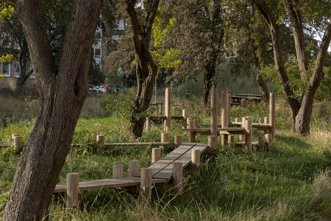 Alongside the design of the new park, the National Arts Council of Denmark commissioned the artist Kerstin Bergendal to a four-year experimental art intervention. Her project, ‘Concerning A Meadow’, unfolded in a glitch between spatial planning, citizens’ engagement, and a new mandate for public art. As such, it offered the city’s planners, SLA’s internal Social Design Team, and local residents a parallel process for the unplanned and informal knowledge exchange regarding the park. Kerstin Bergendal also added a series of wooden art structures to the park, elaborated in collaboration with the small landscape studio Efterland. The art structures are seamlessly integrated into the park’s natural fabric, giving children as well as adults varied opportunities for play, exercise, and socializing on the wooden art elements.