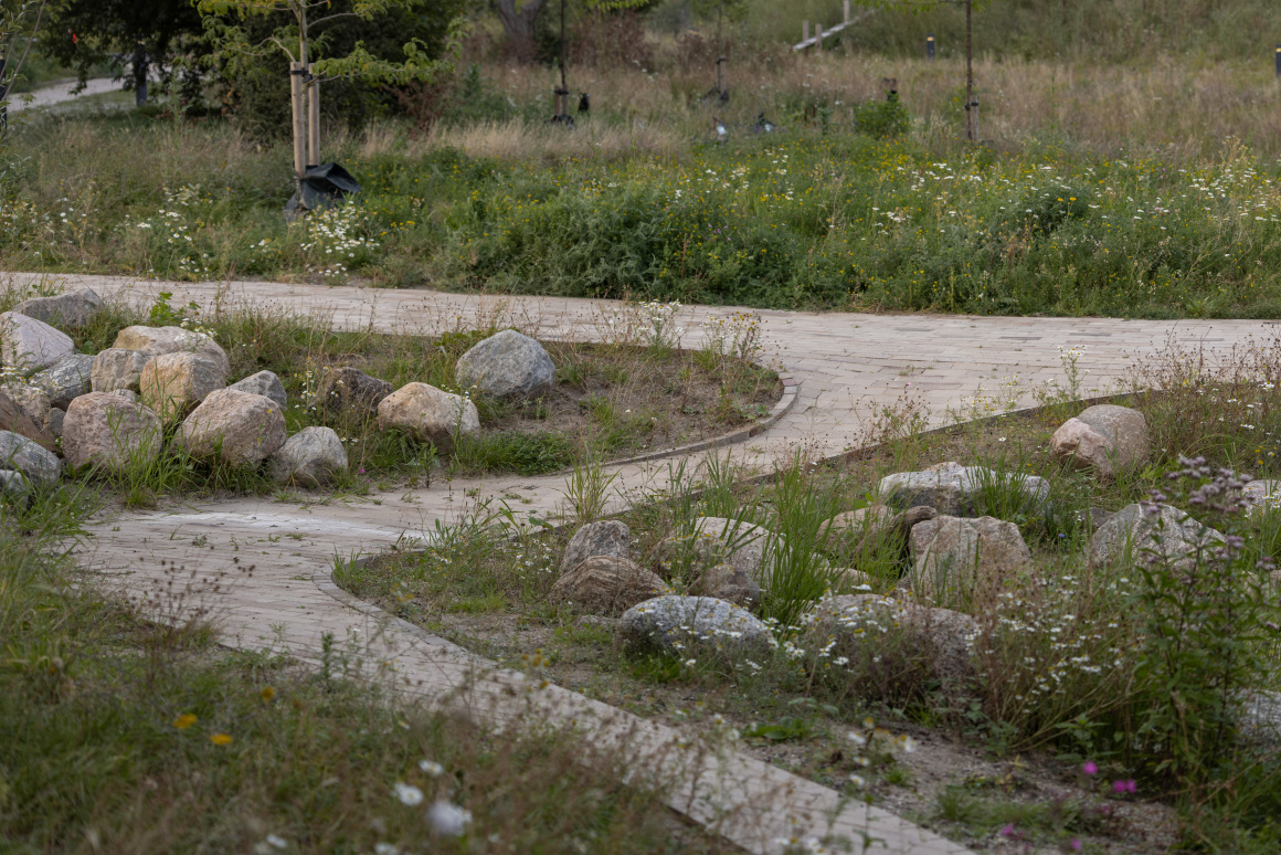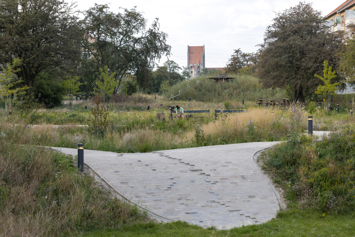 A meandering path of gravel and yellow tile (a nod to the iconic neighbouring Grundtvig’s Church) knits together the park’s different areas and typologies and is designed to draw people out into the park to experience the city nature design up close.