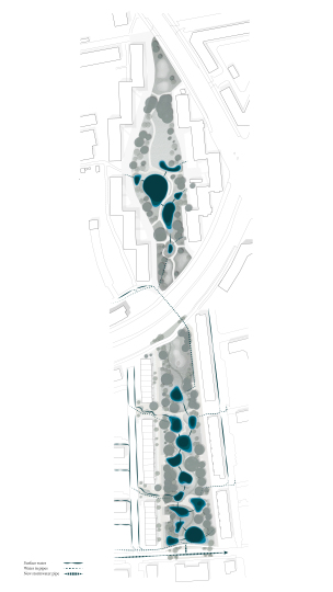 By letting the form of the park follow the processes of nature, SLA created an interconnected series of 18 bioswales throughout the sloping green areas that can collect, contain, and infiltrate more than 3,000 m3 of rainwater falling in the park and the adjacent courtyards and streets.