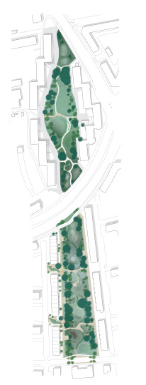 同时为社区及其居民增添社会、自然和文化价值。该公园根据其气候和社会功能设计了五种主要的自然类型:潮湿的生物绿洲,自然和野生动物拥有通行权;树干之间的小型干燥群落,用于亲密玩耍和放松;公共草坪用于体育、农贸市场、社区晚宴和公共活动;为居民提供非正式社交和休憩场所;碉堡山,将旧公园冷战时期的地下掩体改造成灵活的社交场所。