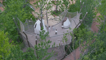 Through bionic design and the selection of ecological materials, the design team constructed bionic landscapes and equipment. For example, the staggered and layered surface of the tall towers simulates the cracked texture of metasequoia bark: Brown wooden panels are arranged in proportion to replicate the mottled texture of natural bark. Extracting the imagery of wood fibres, the team built the Fiber Recombination Net Bed which envelops the body in a beige mesh surface, offering gentle material comfort for the spirit.