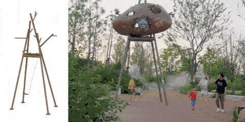 The Seed Swing takes inspiration from the seeds of Metasequoia trees which hide under leaves. By using mechanical devices, the Seed of Courage comes out from the bamboo treehouse and interact with visitors when they are swing.