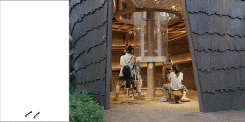 种子秋千以枝叶间的水杉果实为灵感,当游客荡起秋千,勇气种子便从竹编树屋中探头出来,通过机械装置与游客进行实时互动。