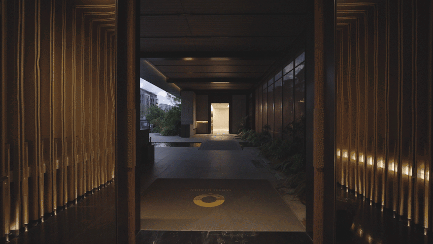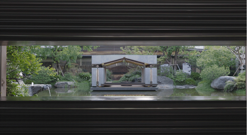 大门中央借鉴中式园林框景手法,以半透金属网帘为画布,两侧灰色的拼贴石墙为框,摇曳的朦胧光影植色为墨,描绘一副诗意山水画卷。