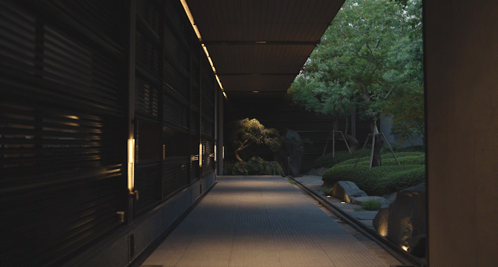 At the gate’s center, borrowing from the framing techniques of classical Chinese gardens, a semi-transparent metal mesh curtain serves as canvas, framed by textured gray stone walls on either side. The play of swaying, ethereal light and shadow, together with carefully chosen plantings, provides the ink, creating a poetic landscape painting.