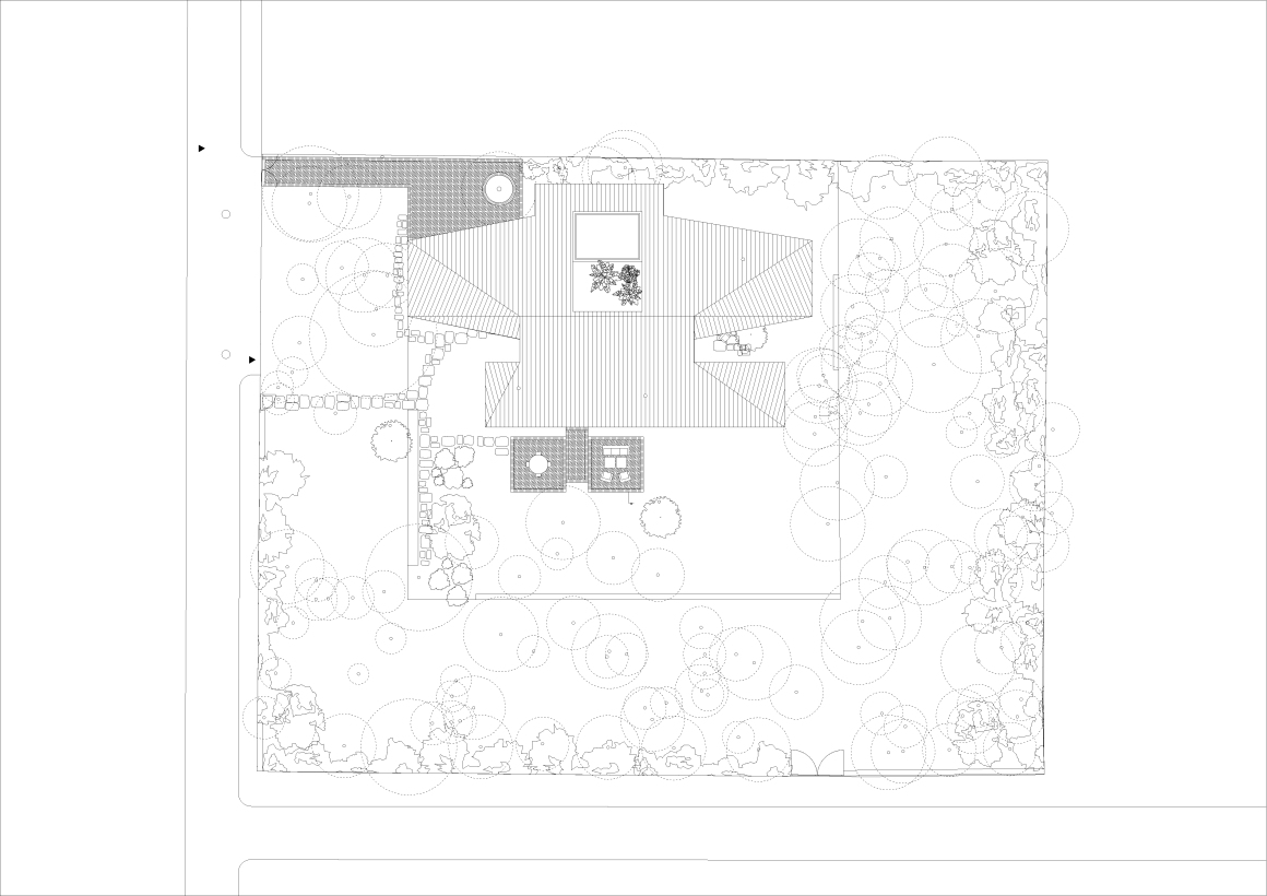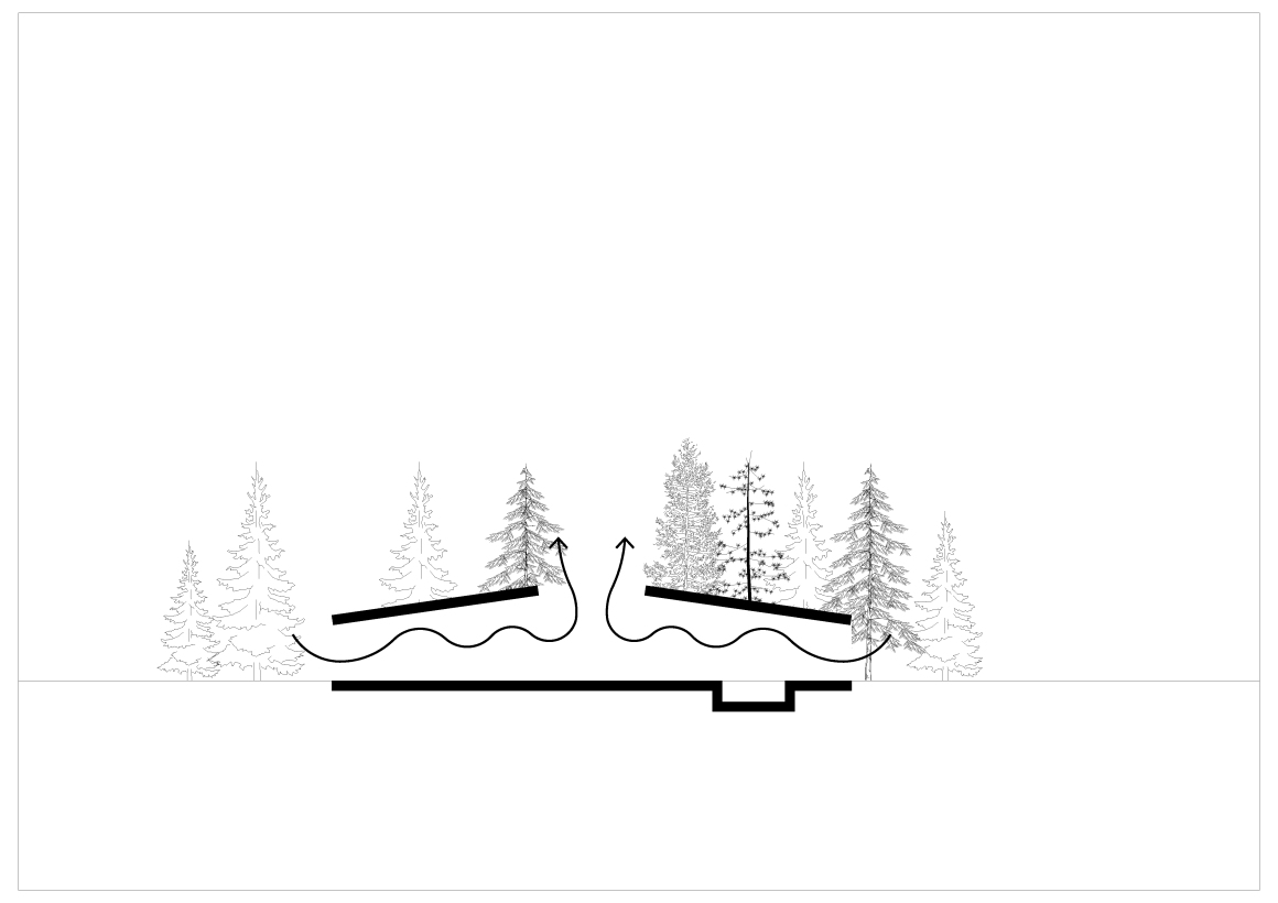 This idea became the starting point for the project. A single-storey home, organized entirely at ground level, concealed beneath an expansive roof of tent-like geometry – designed so that its inhabitants would always be together. The Sadowskis wished for their house to remain open to the surrounding nature, rooted close to the earth. Hence the glazed structure that blurs the boundary between interior and exterior. At its center, the architects designed an atrium with an inner garden and a retractable glass roof, enabling the residents to dwell inside the house while simultaneously under the open sky. From the east and west, two semi-courtyards cut into the volume, drawing greenery deep inside. At the owners’ request, a panoramic 22-meter-long sliding window was added, opening the living space toward the forest and fusing the house with the garden. Movable walls and the opening roof allow for a seamless interplay of light and space, while also creating natural ventilation – functioning much like in a tipi. With the circulating air, the wind brings inside the sounds and scents of the forest.