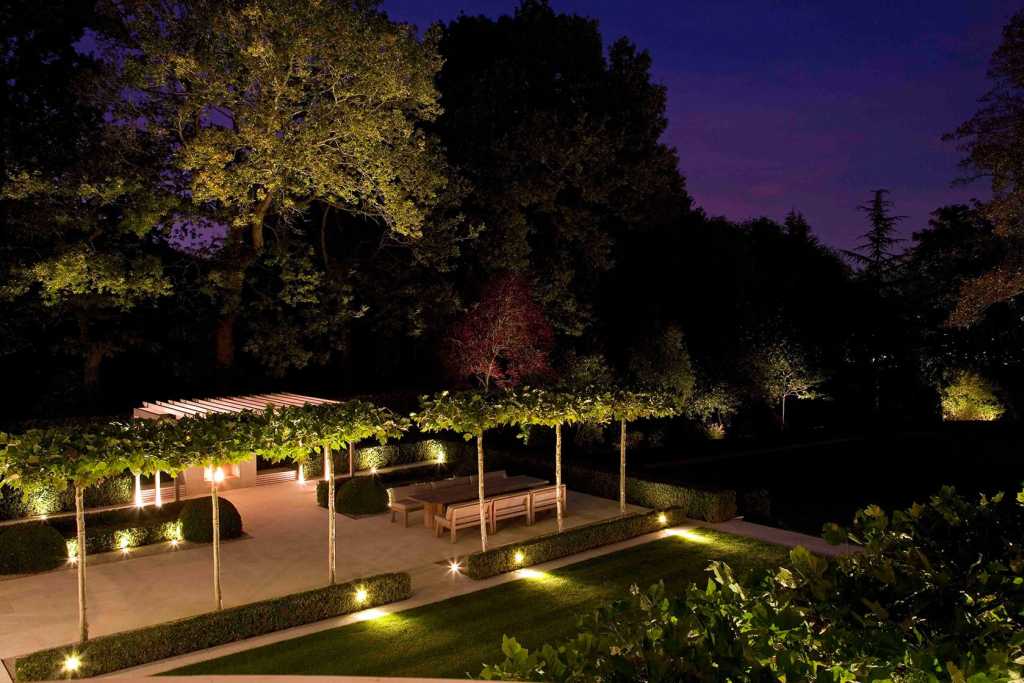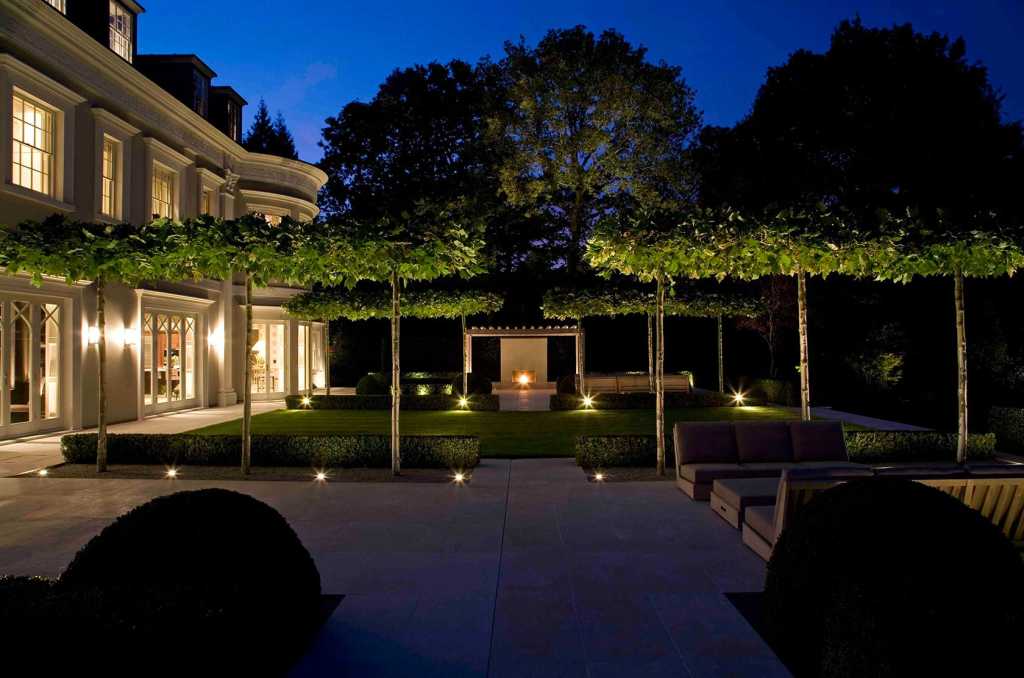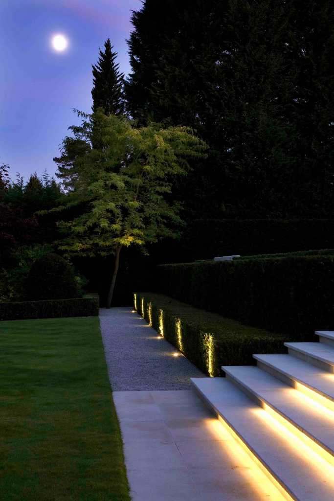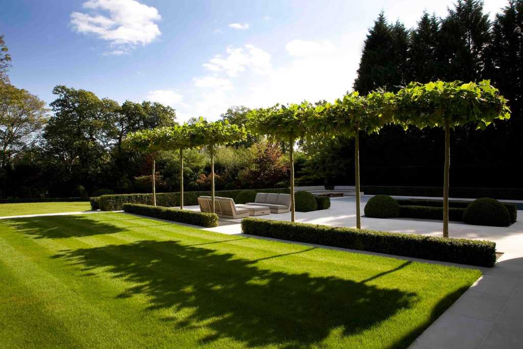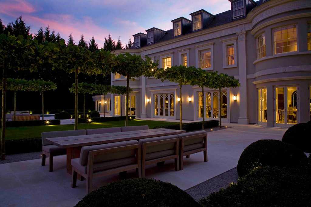 Beyond the terrace, which is constructed in a scale so as to connect the large, wide house to the landscape, a sequence of spaces open up views and connections to the mature woodland beyond. There, the formality of the garden gives way to a looser, wilder quality but the two remain intrinsically connected by the repetition of topiary and hedging.
