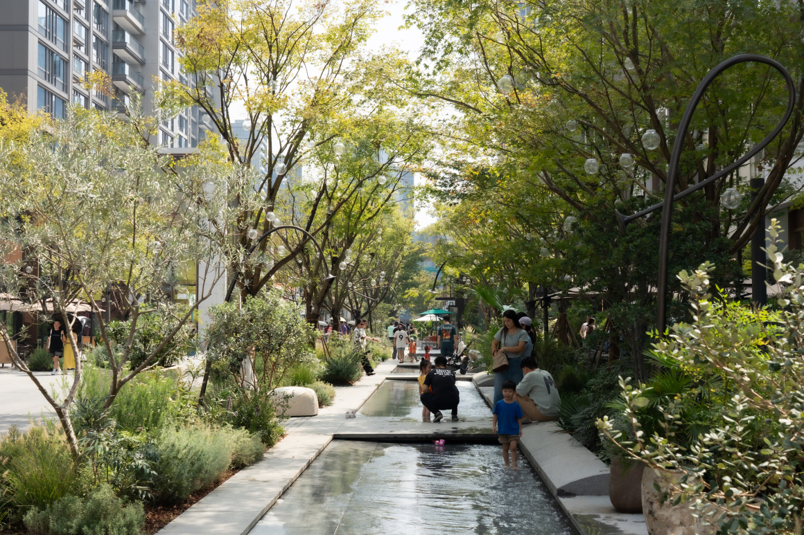 更新后的自然丛林掩映在原有的浪涌水景上,带回了那些关于溪水的生活记忆,如同在九溪烟树或在运河边,是松弛感与互动性的融合。