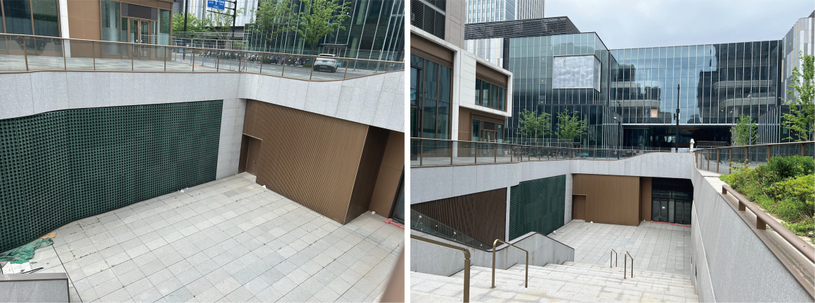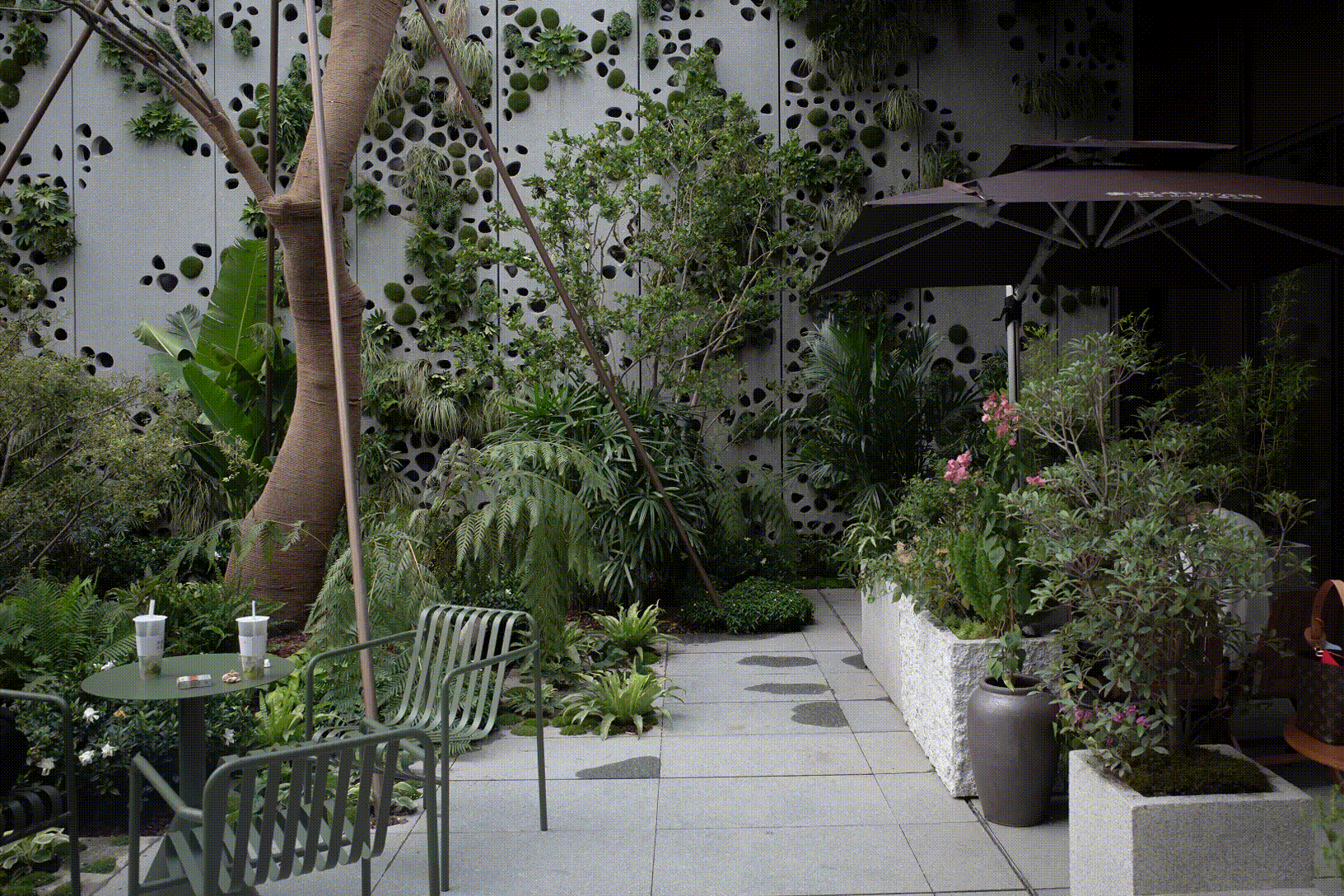 Located in a sunken plaza connecting the mall’s basement level with the commercial street, the Grotto Garden serves as a portal of arrival for many citizens emerging from the underground retail area. When the design team first visited the site, it was raining. The pitter-patter of the rain sparked an imaginative question: what if, upon emerging from the sunless basement, one could encounter a subterranean haven veiled in mist and moisture, where even the air felt damp and fresh—a truly refreshing experience? This notion became the foundation for the Grotto Garden concept.