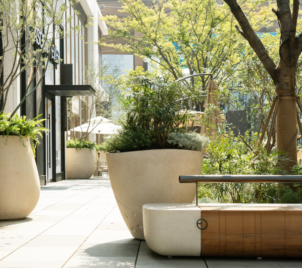 Planting pots inspired by the forms of Southern Song Dynasty wine cups are distributed throughout the street in various sizes. Their introduction has made the street feel more crowded, yet we believe this kind of “crowding” is precisely right. They compress the space to amplify its bustle and vibrancy, drawing people closer together. Simultaneously, the plants they hold contribute to the increasingly lush greenery of the Asian Games Mixc World.
