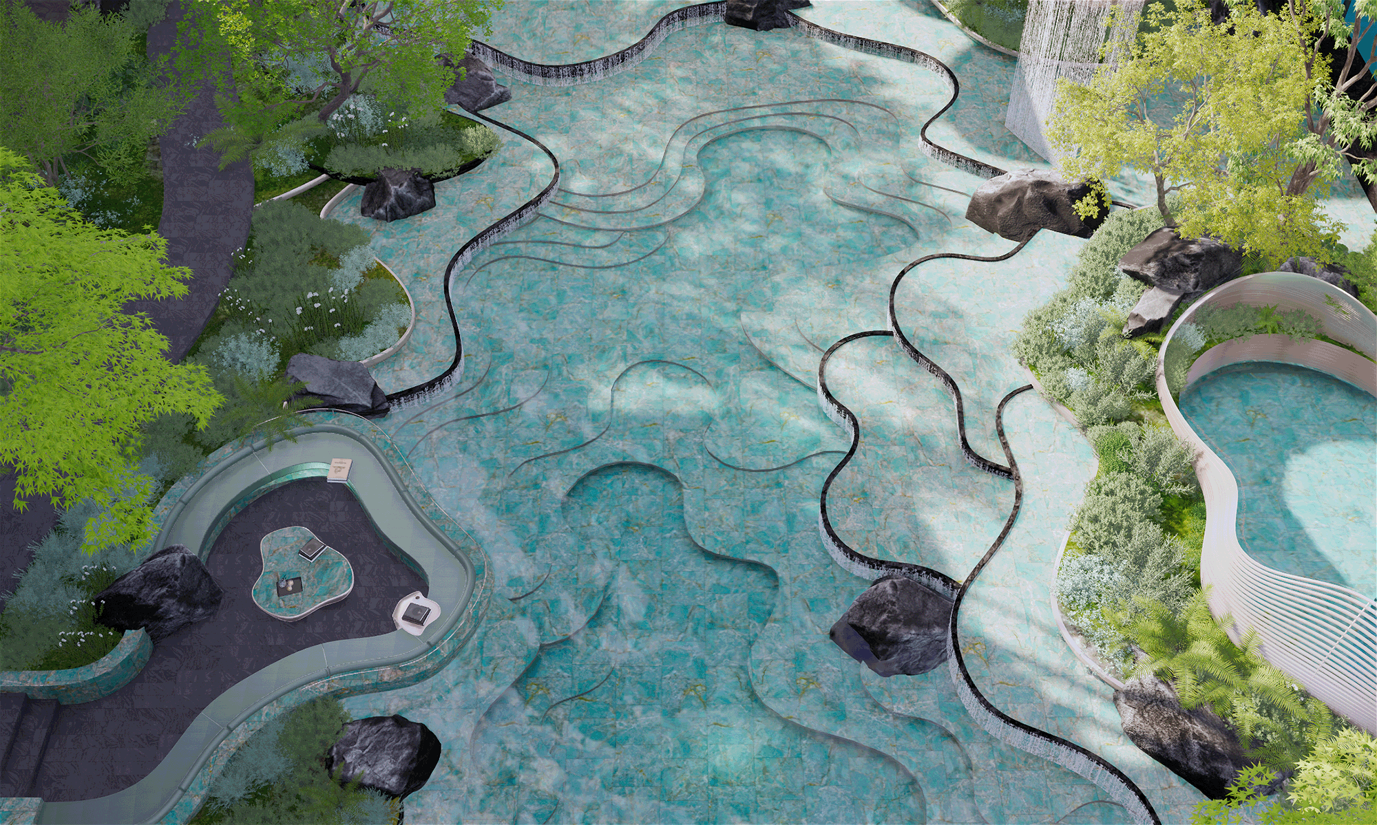 底层水景自由扭动的弧线层叠错落,为了还原瑶池五彩池斑斓通透深邃的水色,我们在池底铺装的弧线设计和材料选择上都进行多轮推敲并实体打样。在数十种材料中最终选择亚马逊绿,其纹理或如碧波荡漾,或似翡翠交织,遇水呈现自然深邃的视觉效果,在光线折射下可呈现波光粼粼的动态美感。