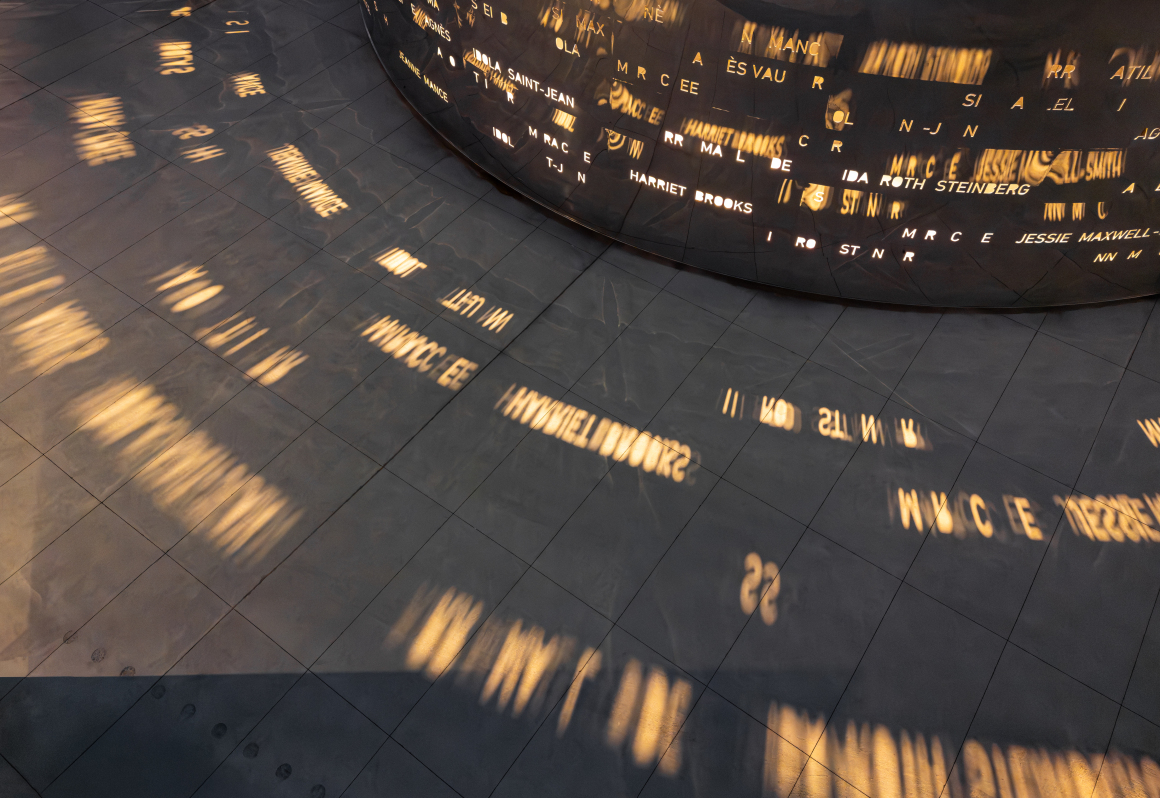 A cylindrical mirror rises near the metro entrance. Inscribed across its entire surface are the names of the women being honoured, with letters that fragment across the landscape and disperse from the mirror to the neighbouring staircase. Passersby are thus invited to rearrange these letters to compose infinite variations of women’s names, ensuring they are never forgotten.