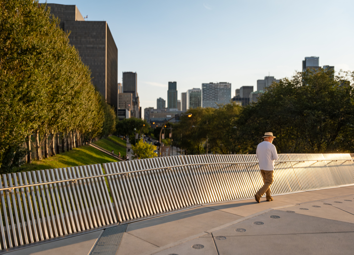 Winner of an international multidisciplinary landscape architecture competition launched by the City of Montreal in 2017, this concept harnesses the full potential of an architectural approach through stratification, transforming an urban scar into an animated destination: a multifunctional plaza that is simultaneously an inclusive memorial space, a universally accessible pathway, and a contribution to urban biodiversity.
