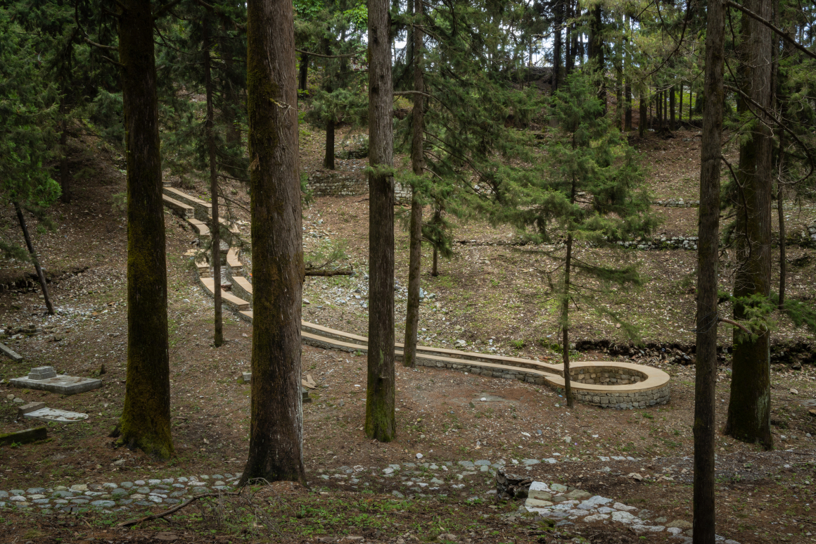Guided by the notion of a journey, physical and metaphysical, the design invites visitors to reflect on memory, life, and nature simultaneously. The restored stone gate, framed subtly by a contemporary metal structure, sets the tone for this dialogue between past and present. A winding stone path organically meanders through the forest, unravelling the story of the site as each installation emerges as a quiet moment of discovery.