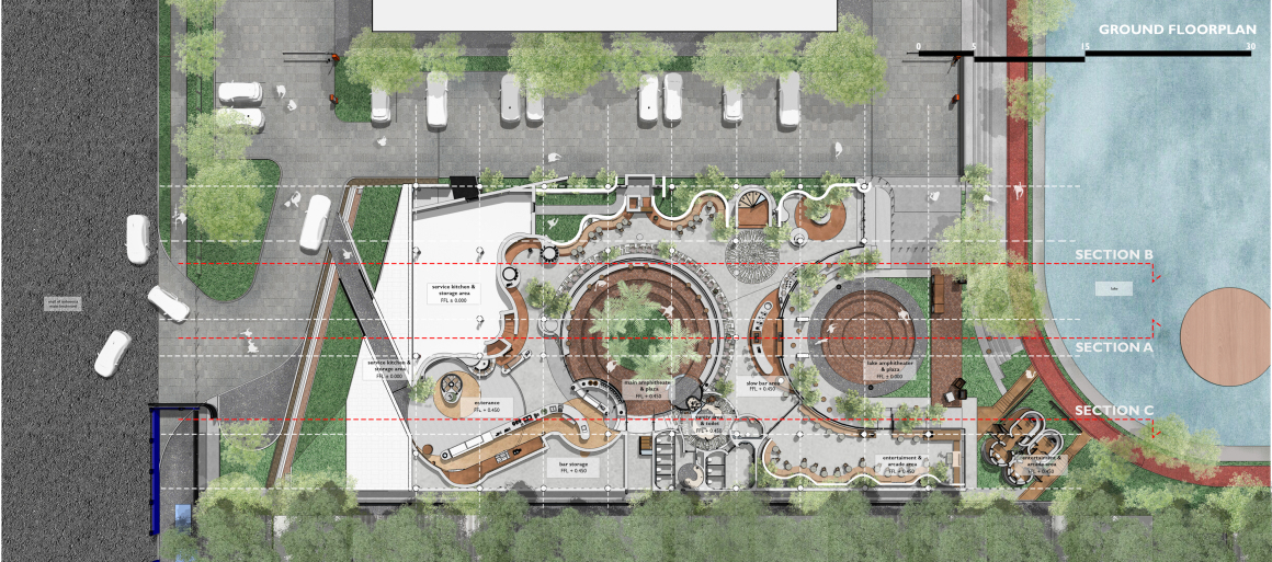 Architecture should not compete with the landscape; it should interact with it, sometimes blending seamlessly into the surroundings and at other times allowing nature to take precedence. Nature envelops the building from all sides, even ascending its slope to create a natural garden on the roof, offering expansive views of the entire area. Every aspect of the design prioritizes unobstructed sightlines. Ensuring the prototype of an arched shelter volumes extend panoramically along the shoreline, featuring large expanses of glazing that open up to the urban lake.