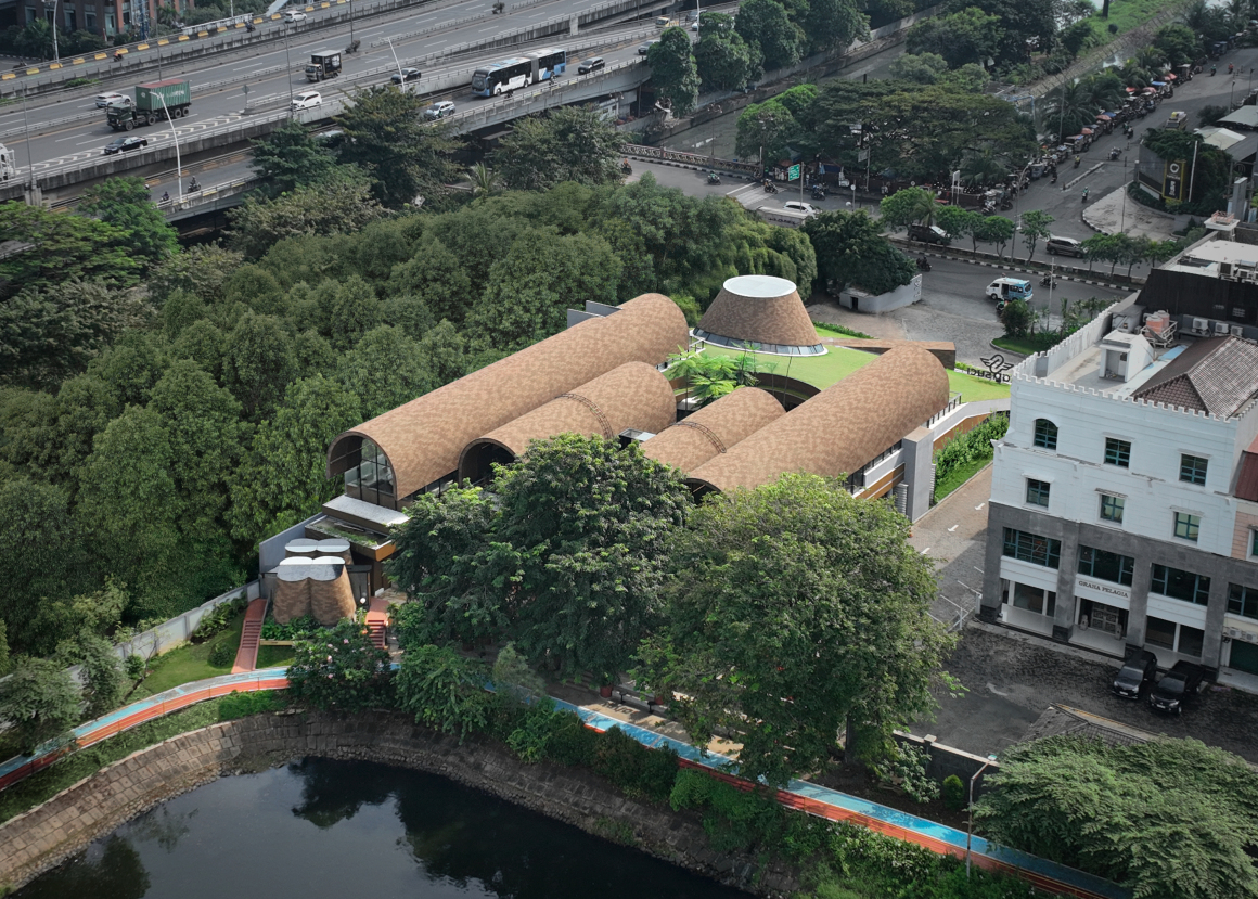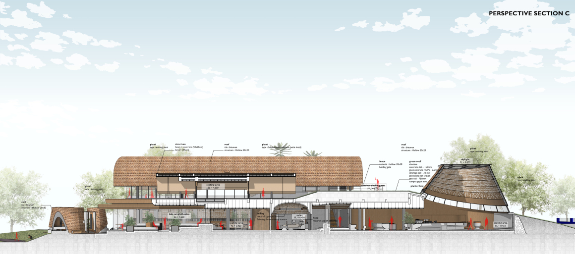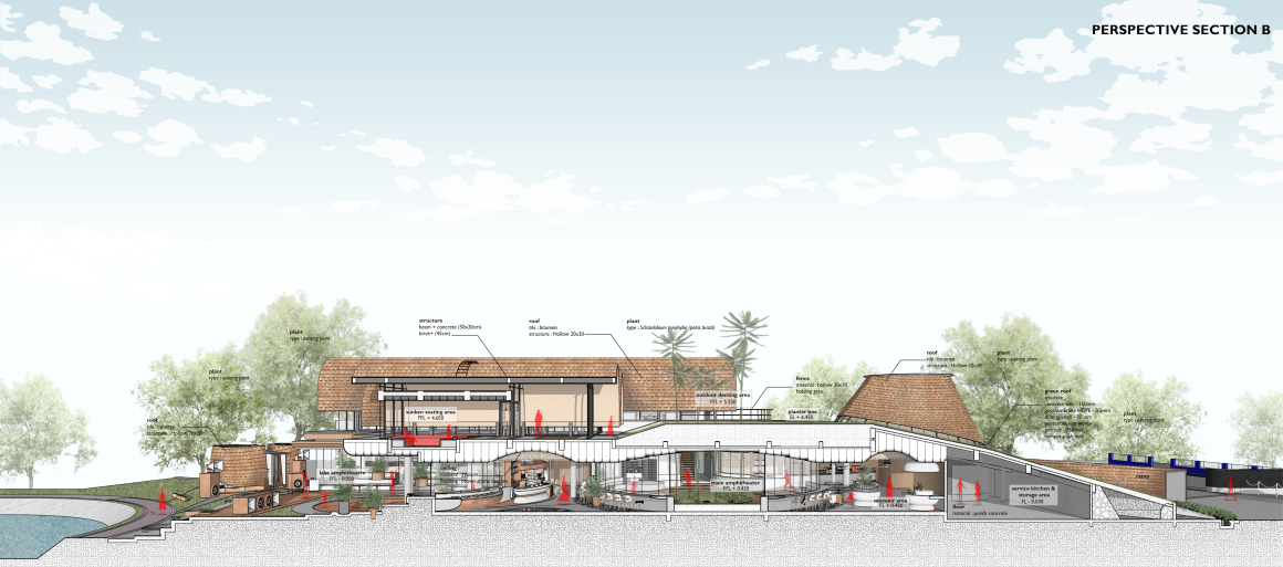In reimagining a flexible, ever-evolving third space prototype that integrates nature, RAD+ar crafted an experience that allows restaurant visitors to engage with the meandering, multi-axial spaces shaded by an expansive green roof, providing respite from Indonesia’s tropical heat. The green roof is designed to slope back, creating additional setbacks and breaks that facilitate airflow and connect the front boulevard to the urban lake at the rear.