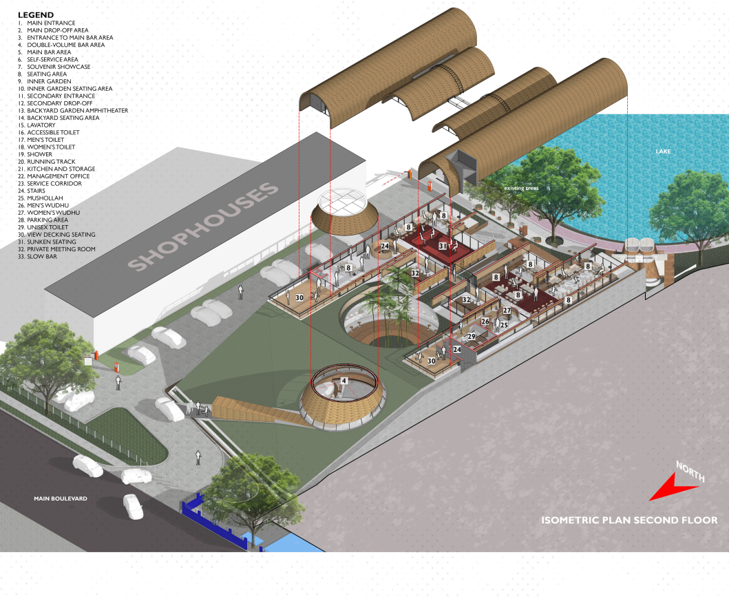 在重新构想一个灵活、不断演变的第三空间原型时,RAD+ar 将自然融入其中,精心设计了一种体验,使餐厅访客能够与被广阔绿色屋顶遮蔽的蜿蜒多轴空间互动,为他们提供避开印度尼西亚热带气候的栖息之所。绿色屋顶设计为向后倾斜,创造额外的退让和间隔,促进气流,并将前方的林荫大道与后方的城市湖泊连接起来。