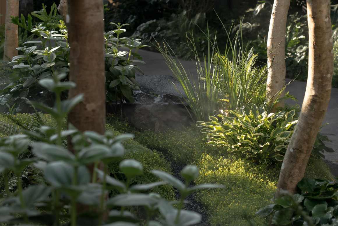 踏入归家的道路,听着流动般的叠水声,挺拔的大树与低矮的灌木倒映在水面上,我们好似身处山水秘境之中。