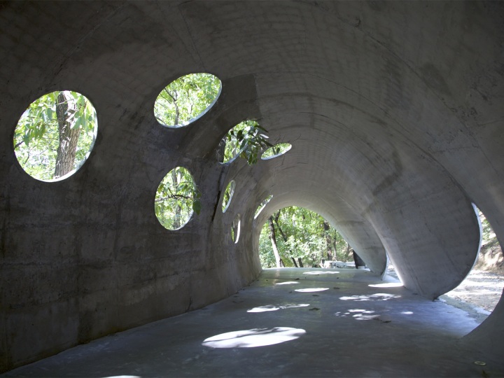 The architecture employs rammed-earth-like rock-colored lime stone. The natural texture of the material allows it to blend into the site, making the landscape the visual center.